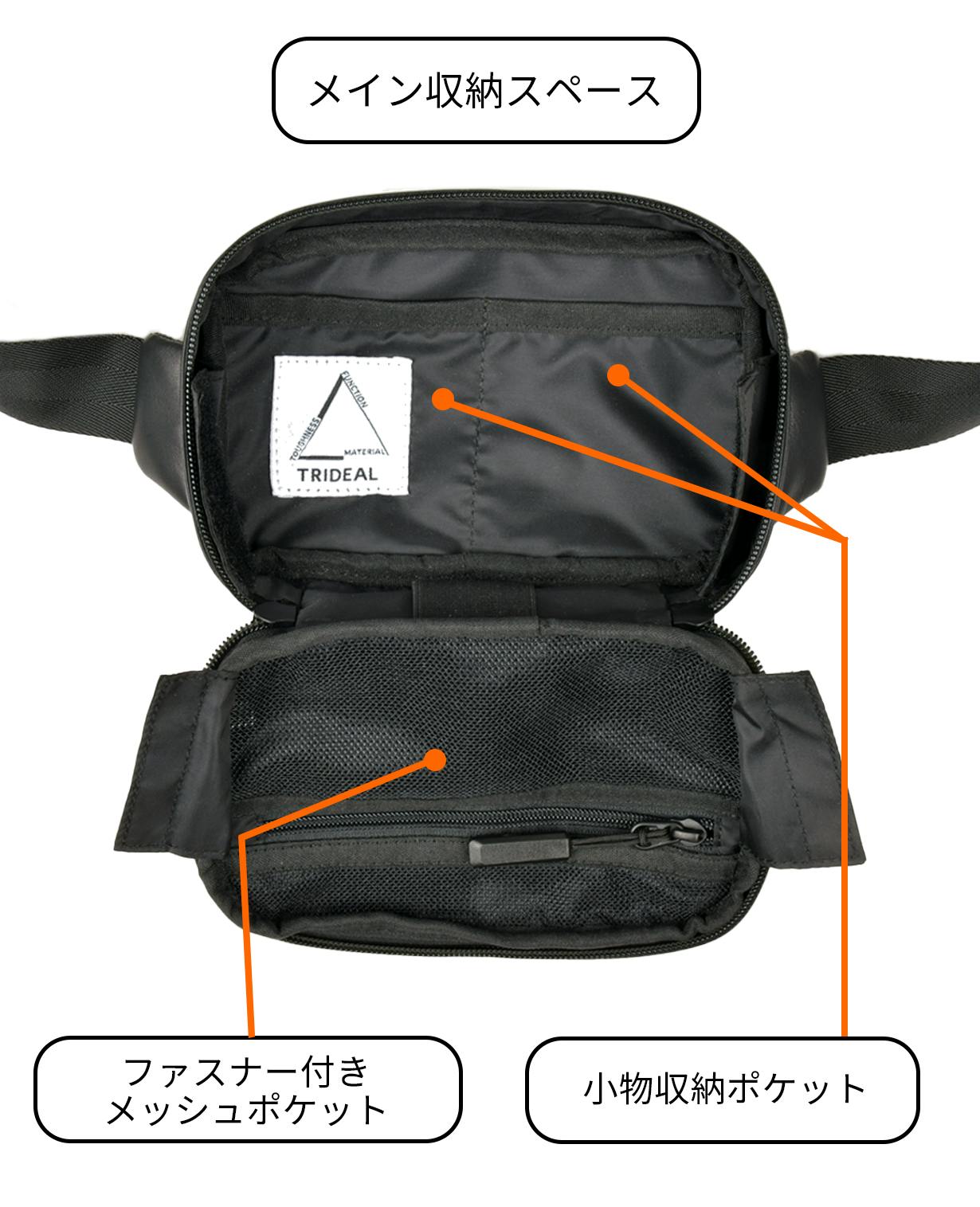 身に付けたまま荷物を出し入れする際に、荷物が落ちないようメイン収納の内側にはマチが付く仕様になっています。