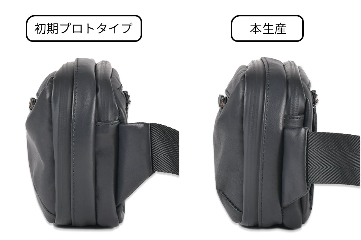 この2点の気付きから、今回はスリングバッグとして斜め掛けすることに特化した新しい防水本革製のミニバッグの開発を始めました。