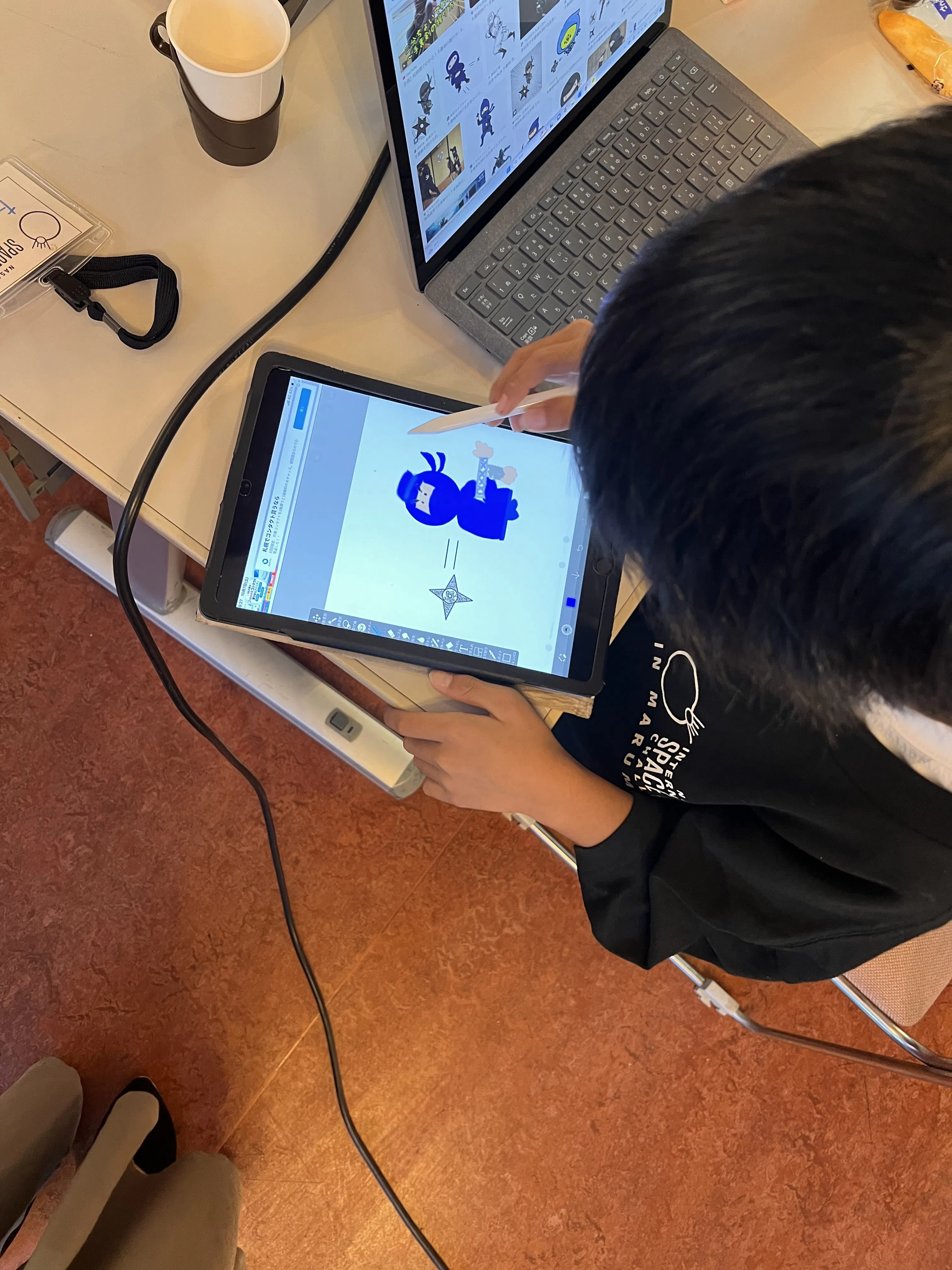 ※写真は昨年度の開催の写真です。初めてのiPadで発表資料に載せるイメージを書いているところ。なぜニンジャ?宇宙じゃないの?と思うかもしれませんが、発想は自由でOKなんです(笑)さまざまな角度から宇宙の事を広める、のがハッカソンの醍醐味でもあります。