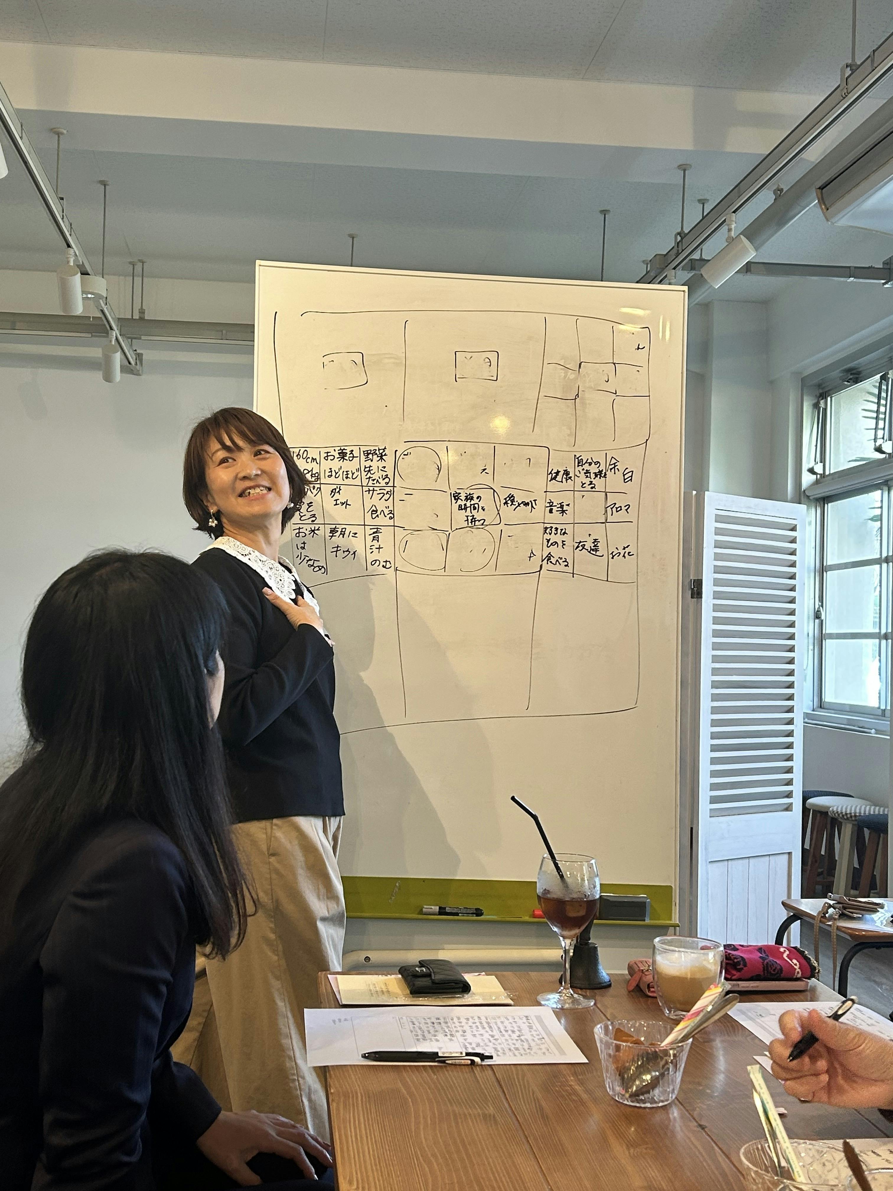 真ん中のマスに書かれた言葉には、・美を追求したい・家族の時間を持つ・家族と元気に過ごす・産後ママケア&国際交流に挑戦したいなど、どれもその人らしい前向きな想いがあふれていました。