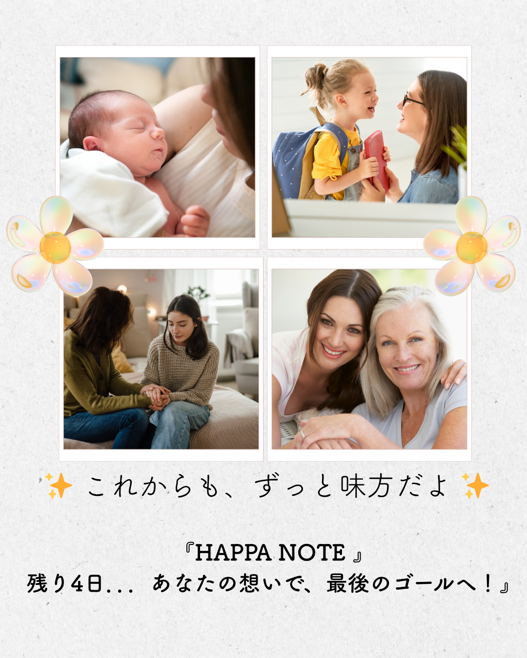 こんにちは。ファミリーゼの浅井奈美です。まずは、8月15日に終了したクラウドファンディングでたくさんのご支援をいただいたことに改めて感謝申し上げます。いただいた資金は「HAPPA NOTE®」の制作費用に大切に使わせていただいていきます。並行して、HAPPA NOTE®をより多くの方に知っていただく活動の一環として「HAPPAランチ会」も開催しています。9月11日には、阪神尼崎の「なないろカフェ」さんで、フェミニンケアのミニ講座とアロマオイル作りのワークショップ、そしてHAPPA NOTE®の体験ワークを行いました。ワークショップでは、ご自身のご両親のことを思いながらノートに書く時間を持っていただきました。「意外と書けない!」「親のことを知らなかった自分に気づいた」そんな声が聞かれ、参加者の皆さんにとって、ルーツや家族のことを改めて考えるきっかけになったようです。HAPPA NOTE®は、命のバトンをつないできた奇跡を、次の世代に「そっと見守り、応援しているよ」という気持ちとともに伝えていくノートです。クラウドファンディングでご支援いただいたおかげで、こうした活動を広げることができています。次回のHAPPAランチ会は 10月2日(木) に開催予定です。アクサ生命の竹嶋龍之介さんをお迎えし、老後資金・教育資金について学べるミニ講座を行います。これからも、HAPPA NOTE®を通じた活動の様子や制作の進捗をこの活動報告やブログ(https://www.happa-note.com/blog/)でお知らせしていきます。どうぞお楽しみに。