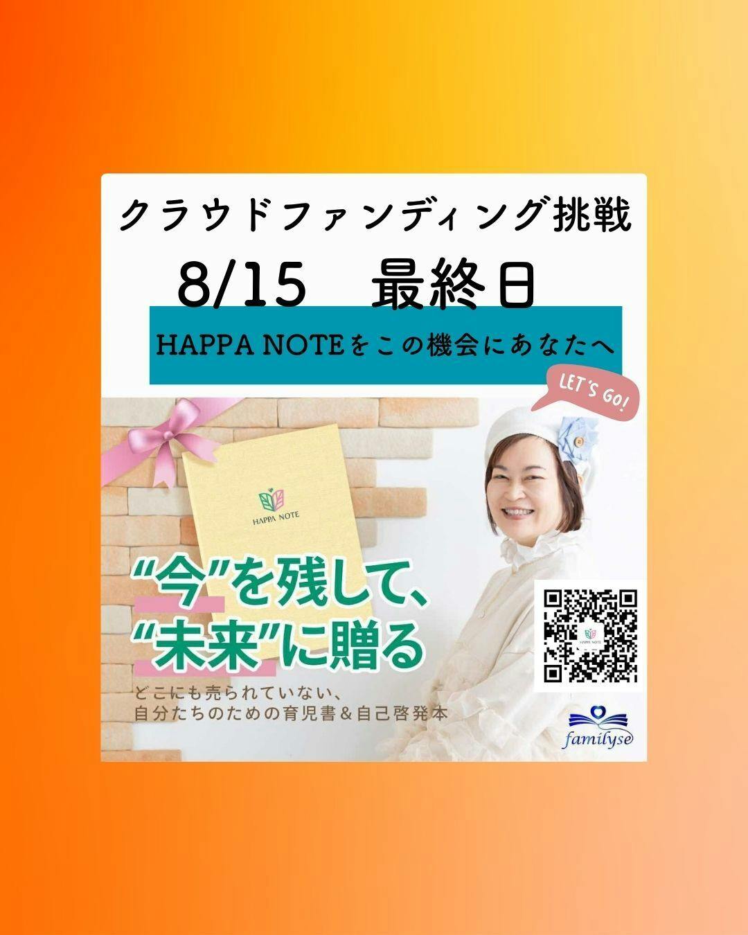 【クラウドファンディング、終了しました】ファミリーゼの浅井奈美です。当初の目標「30万円&100人」のご支援は大きく超え、最終的に 821,300円・122人 もの皆さまが力を貸してくださいました。金額的なご支援以外にも、SNS等でのシェア・拡散、ご自身の大切な方へのお声かけ、SNS運用アドバイス、ラジオ・インスタライブでのコラボなどなど、皆さまからの熱い愛を感じる幸せな1カ月でした。心からありがとうございます。応援のメッセージやシェア、温かい言葉の数々が、何度も私の背中を押し、ここまで走り切る力になりました。これは、私ひとりの挑戦ではなく、「想いを未来へ届けたい」という、みんなで叶えた物語です。これから、HAPPA NOTEを必ず形にし、支えてくださった全ての方に胸を張ってお届けします。これからが本当のはじまりです。引き続き、『HAPPA NOTE®』事業の応援をどうぞよろしくお願いいたします。深い感謝と、これからの決意を込めてfamilyse 浅井奈美