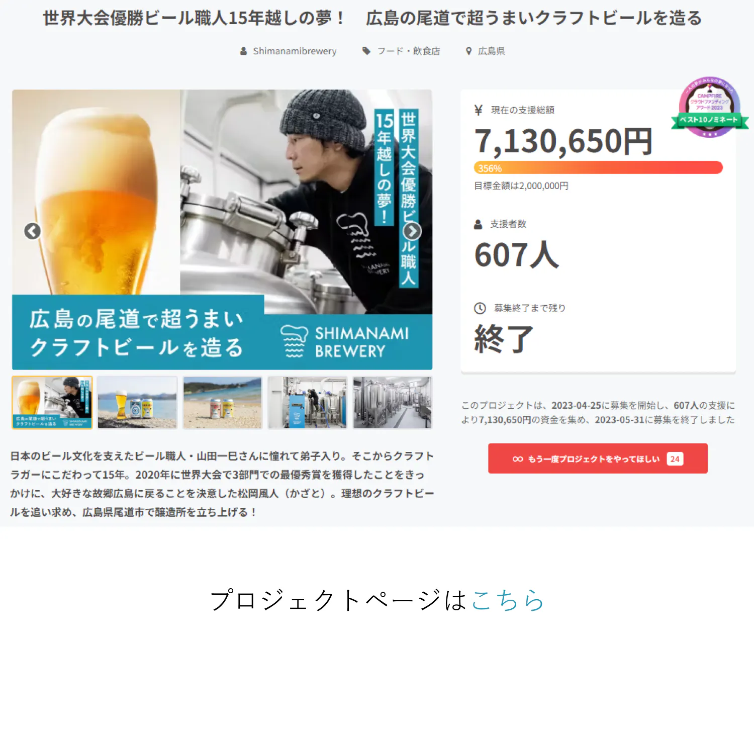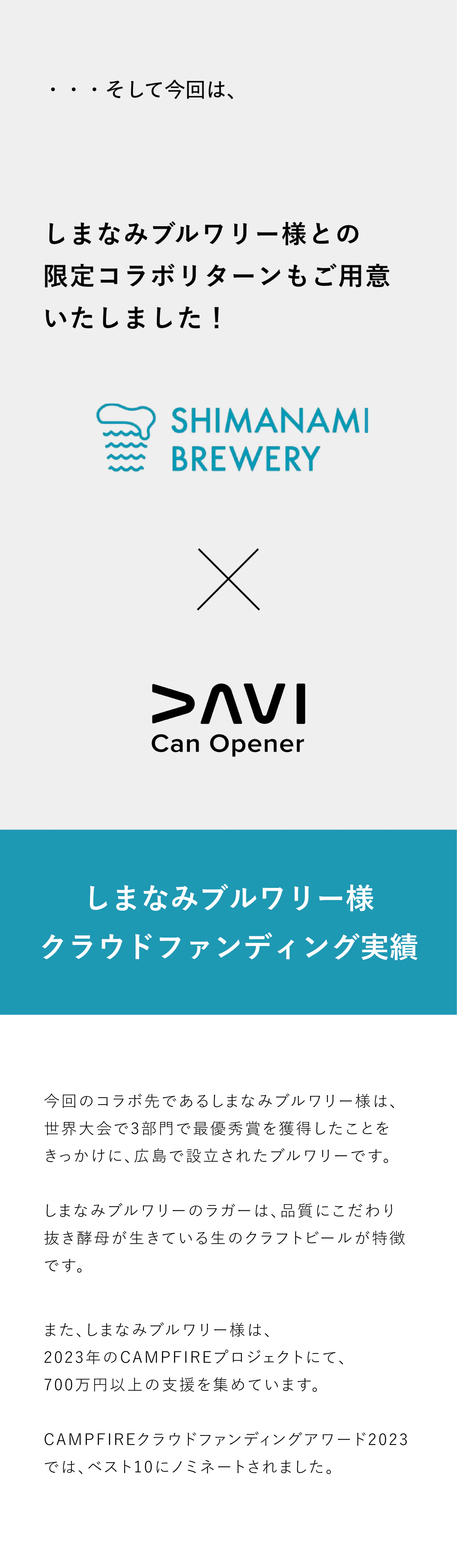 今回は通常製品の提供だけでなく、クラフトビールメーカー”しまなみブルワリー”様との限定コラボリターンやクラウドファンディング限定カラーなど、特別なリターンをご用意いたしました!