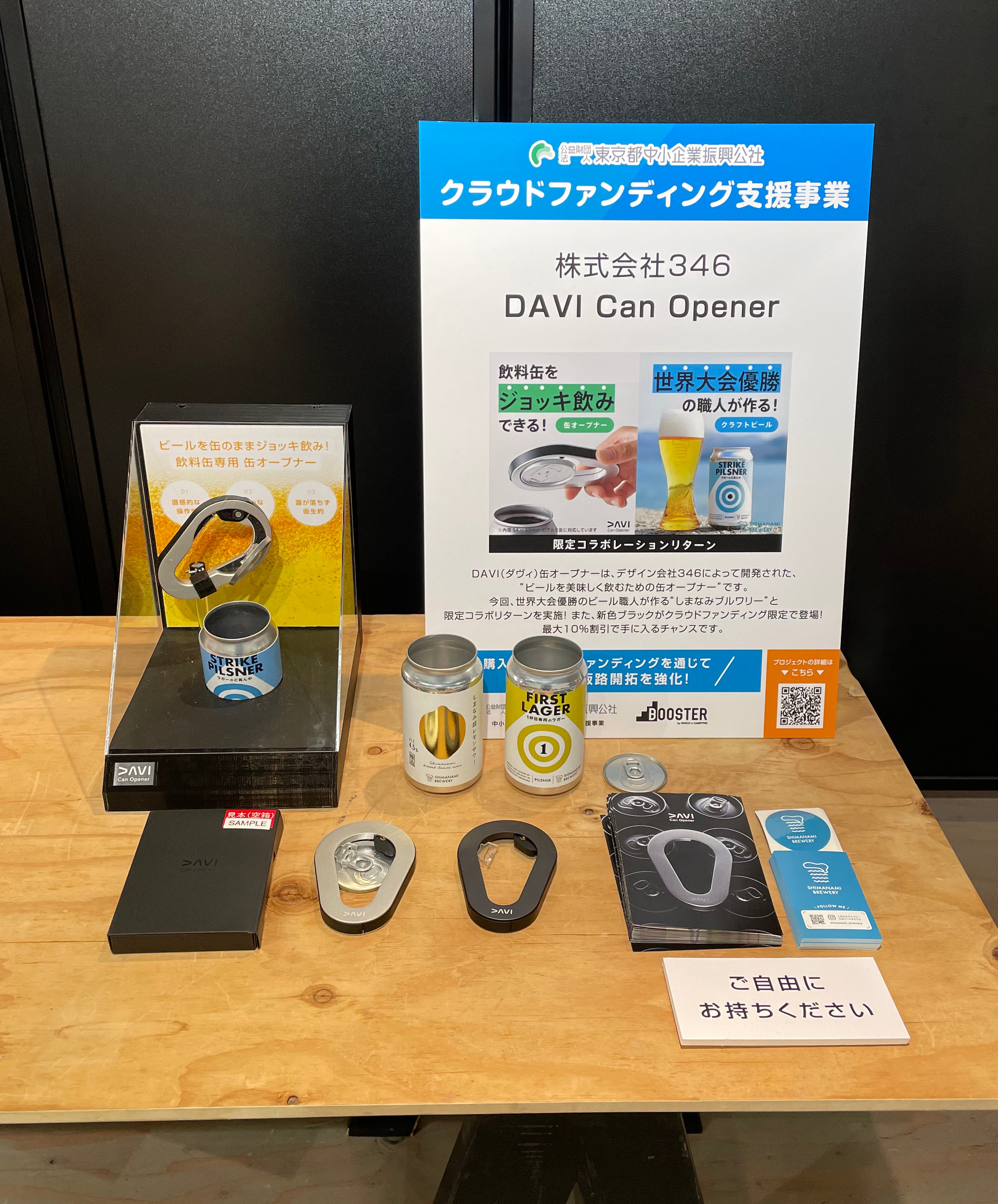 本展示会では、現在実施しているプロジェクトのリターンである自社製品「DAVI Can Opener」および、しまなみぶるわりー様の商品の現物を展示しています。