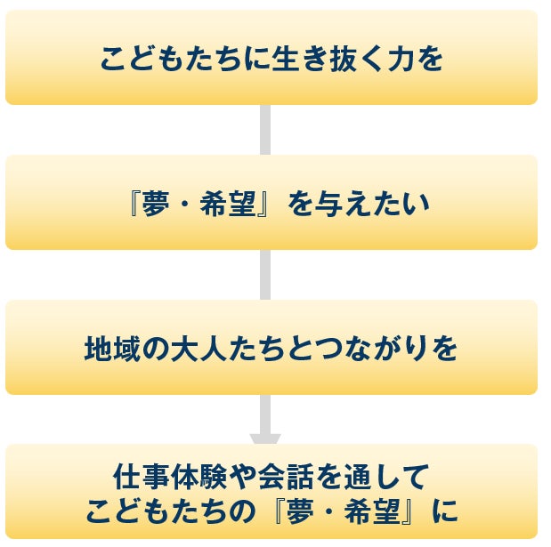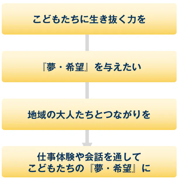 おしごと体験イベントによって、ひとりでも多くのこどもたちに色々な選択肢と可能性がたくさんあることを伝えたい、誇りを持って働く大人たちがたくさんいることを知ってほしい、大人になること、働くことに夢や希望を持ってほしいと考えています。