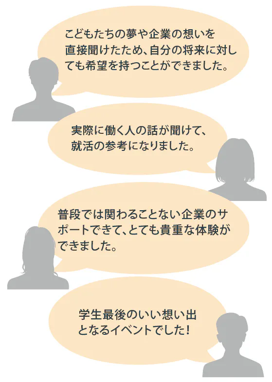 イベントを通してこどもたちの未来に貢献したいというメンバーはもちろん、バラエティに富んだ業界・業種と出会えることを目的として参加する学生も少なくありません。