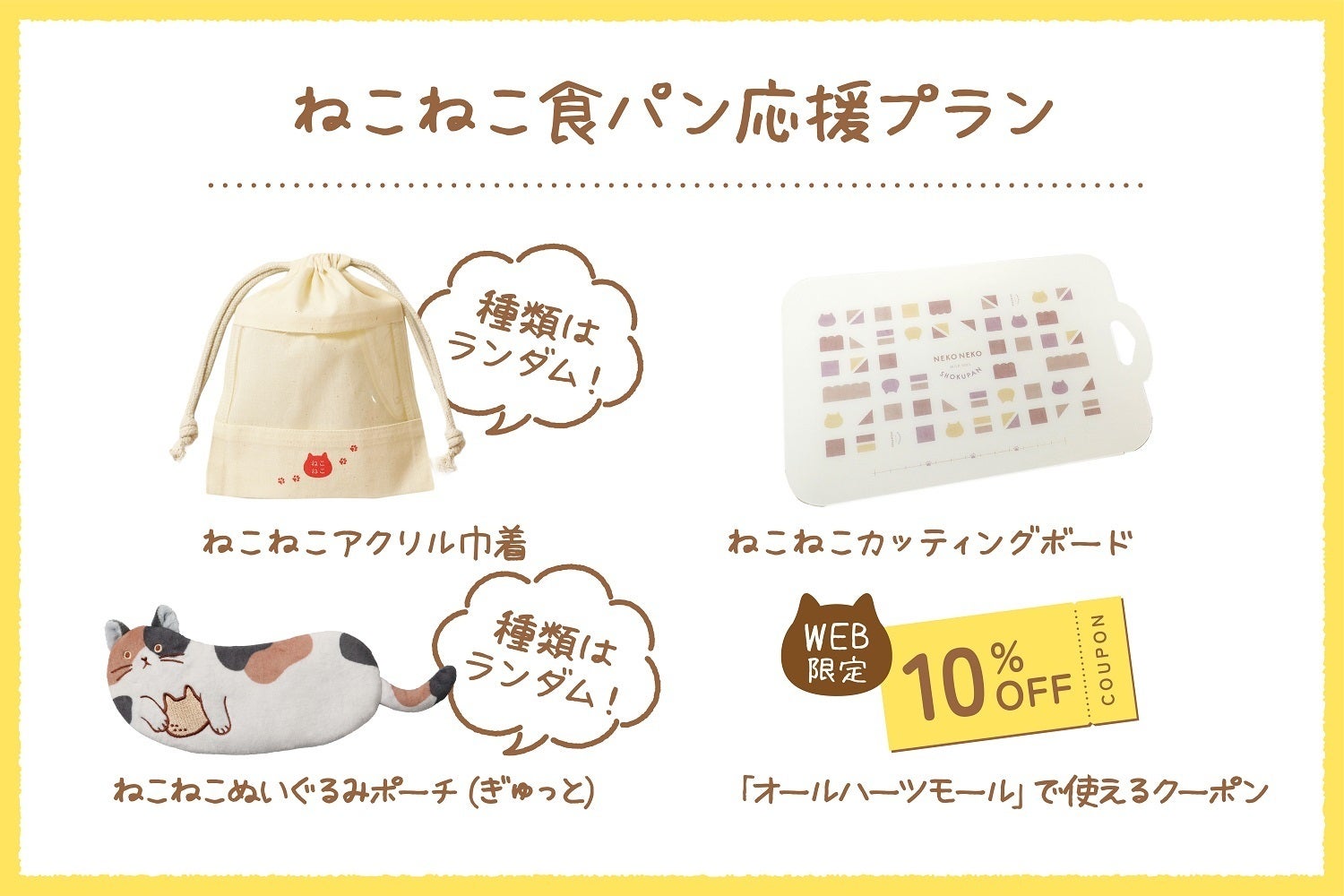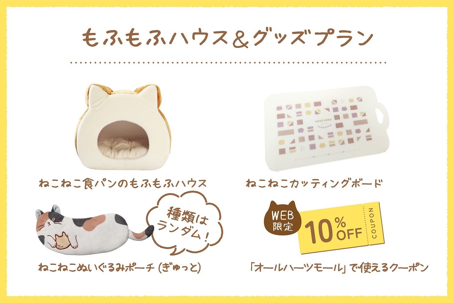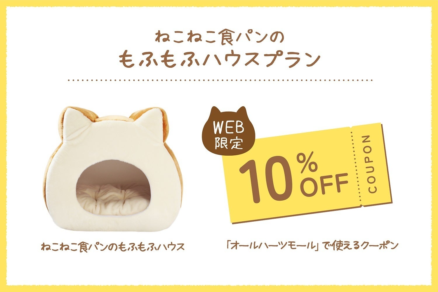 「ねこねこ食パンのもふもふハウス」と公式オンラインストア「オールハーツモール」で使える10%OFFクーポンがゲットできるセットです!※クーポン有効期限:2025年2月末まで