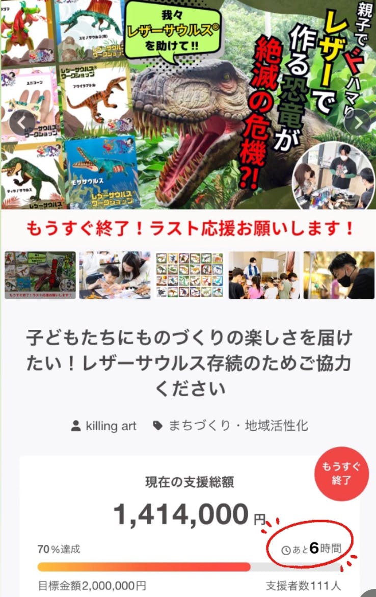2024/08/29 20:00レザーサウルス®︎を応援してくださっている皆さまへkilling art 代表の山本 昌在です!いつも応援いただき本当にありがとうございます!ついに、、、100万円を突破しましたー!!!本当に嬉しいです。応援、本当にありがとうございます!しかし、、今回の目標は200万円なので、最後まで全力で頑張ります!リターンもラストスパートで追加しましたのでぜひ2回以降のご支援もお願いします!僕自身、皆さまからご支援いただいた大切なお金をどのように活用させていただくことがベストなのか。毎日、深く考えながら、活動しています。プロジェクトはもちろん、プロジェクト終了後も、良い形でレザーサウルス®︎の活動を継続できるように精一杯頑張りますので、残りわずかとなった、クラウドファンディングも、応援よろしくお願いいたします!!killing art 代表山本 昌在 もっと見る