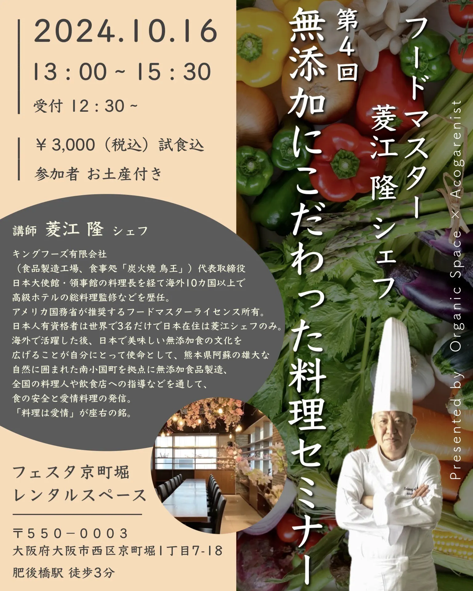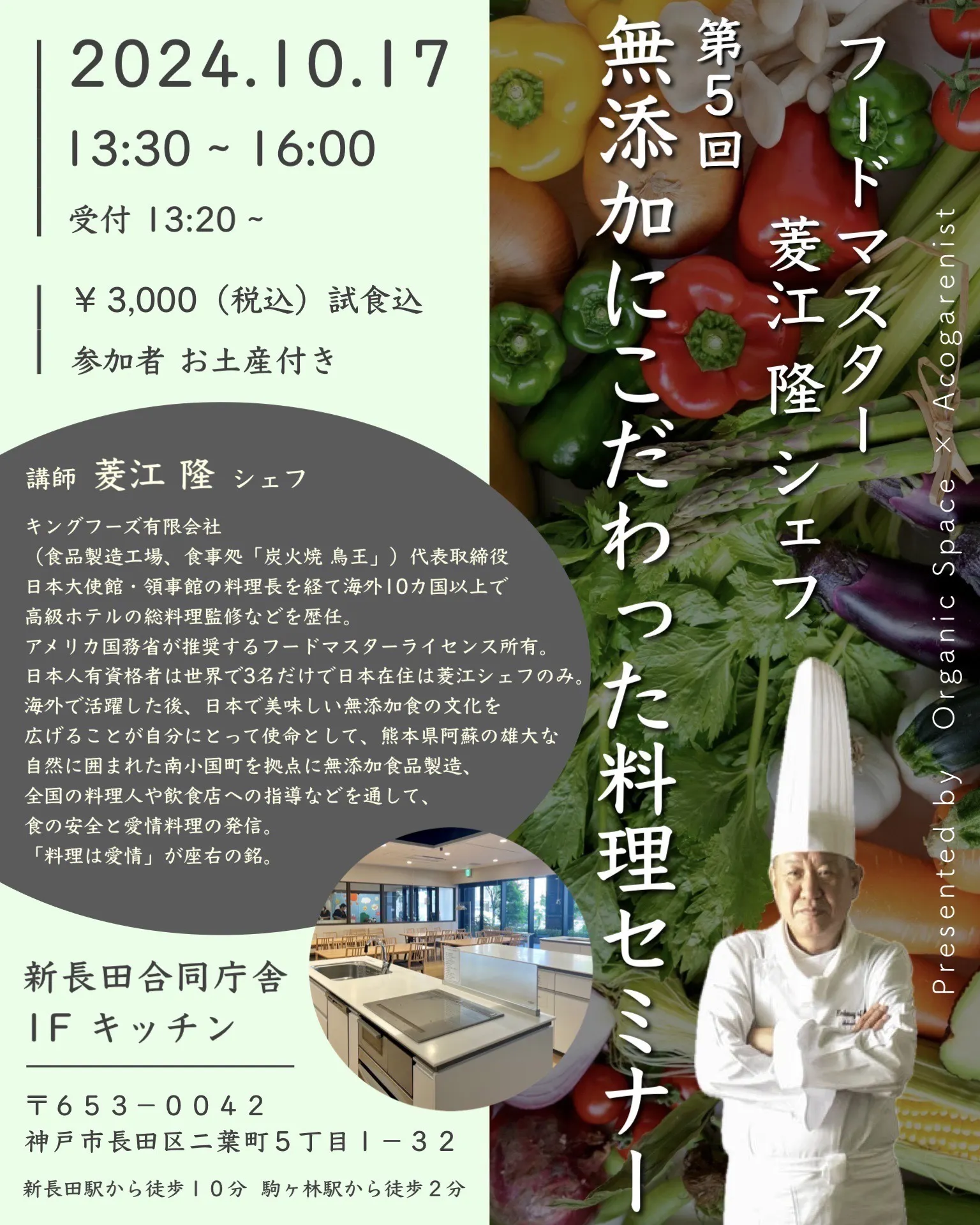 菱江シェフによる添加物のない料理セミナーを、大阪、神戸で開催します。