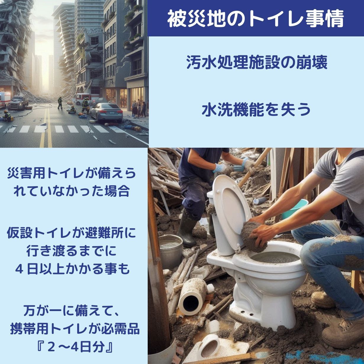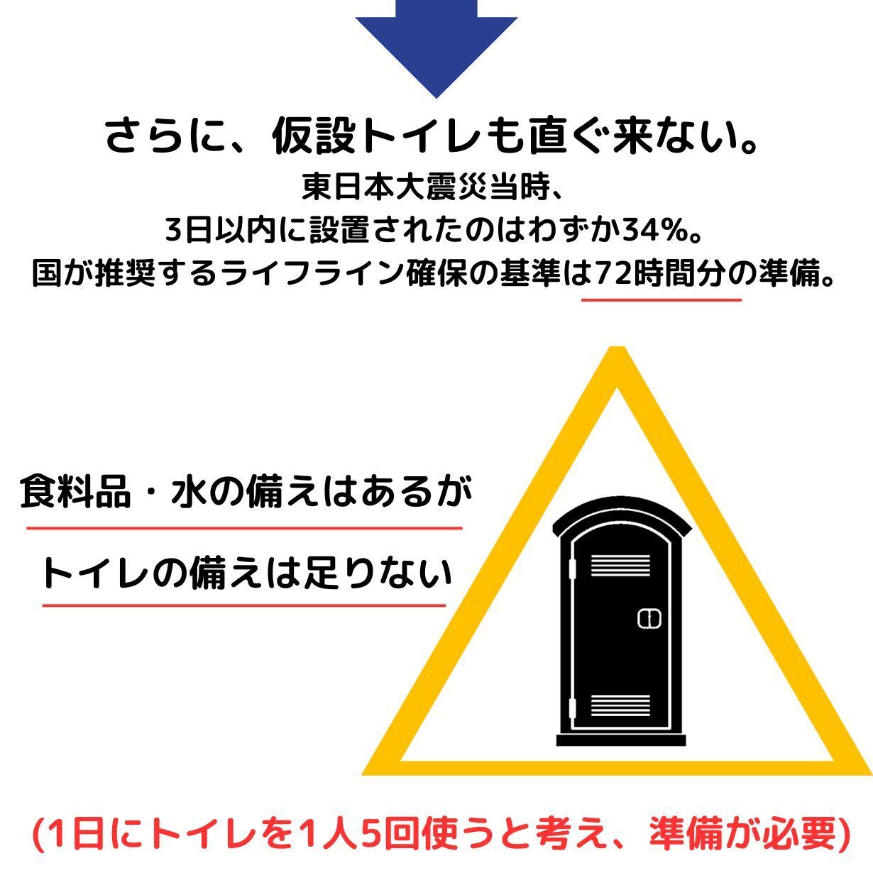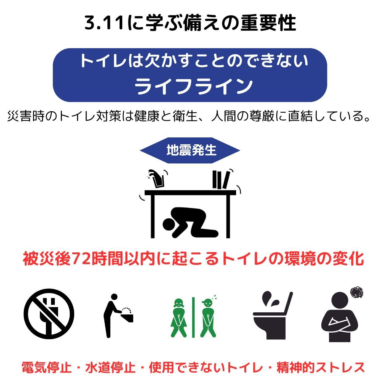 3.11から12年。能登半島地震やいつ再び起こるかわからない災害への対策が求められるなか、かつて多くの方が経験したはずのトイレ問題改善、感染予防対策、人間の生理的現象への配慮は未だ準備不足と言えます。