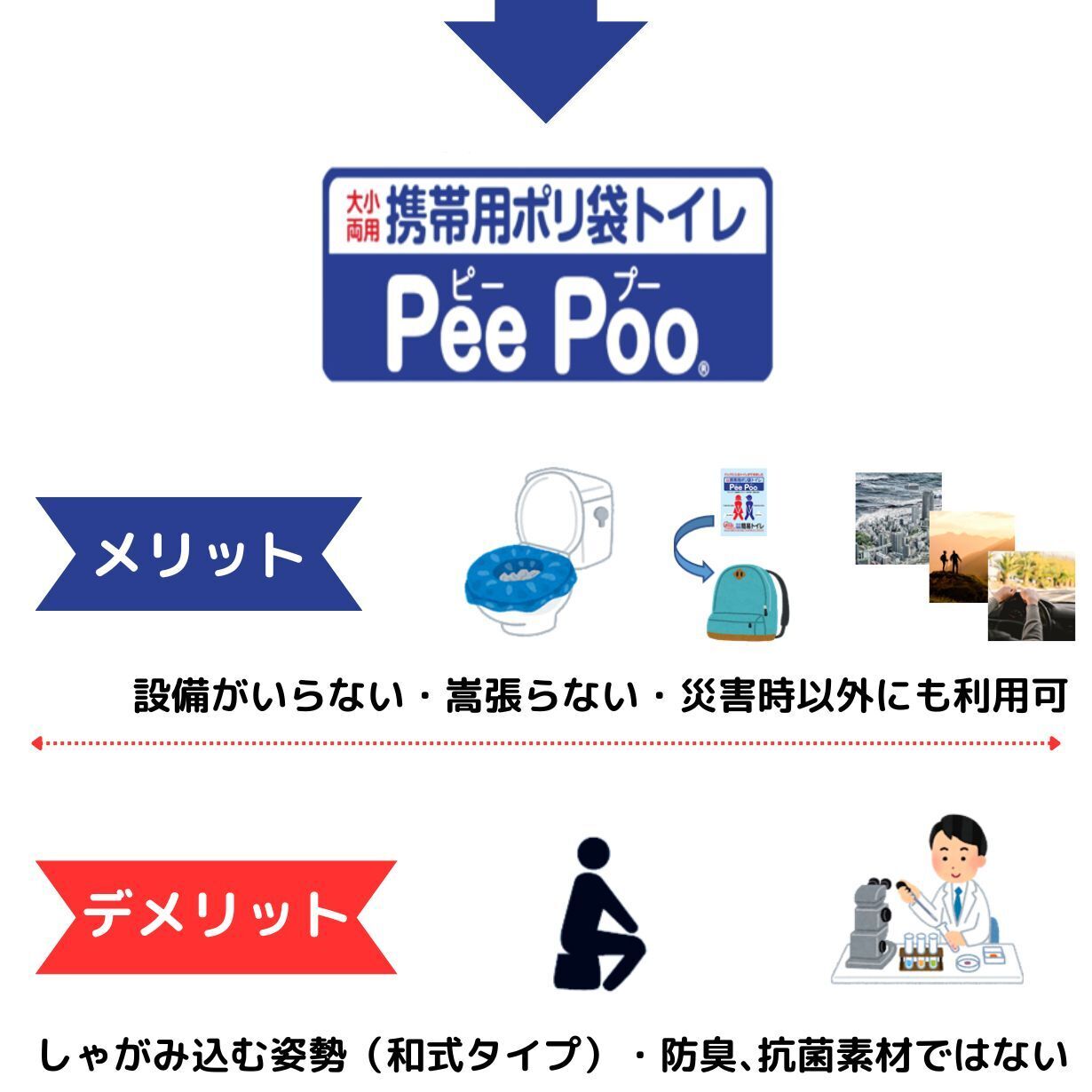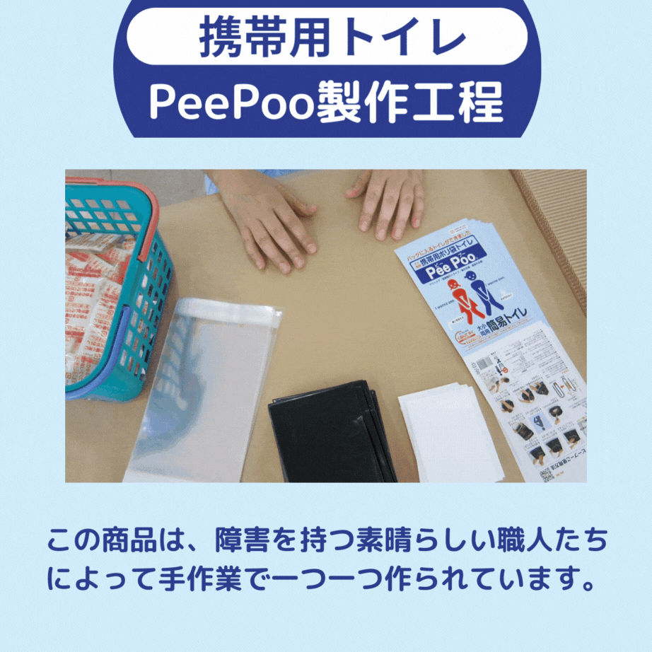 東日本大震災当時、トイレのない現場でおむつ処理袋を災害用トイレとして使用いただき「大変助かりました」という声がたくさん集まったことから、災害時のトイレ・ライフラインのあり方、必要な機能性、利便性を考えるキッカケとなり、PeePooが誕生しました。
