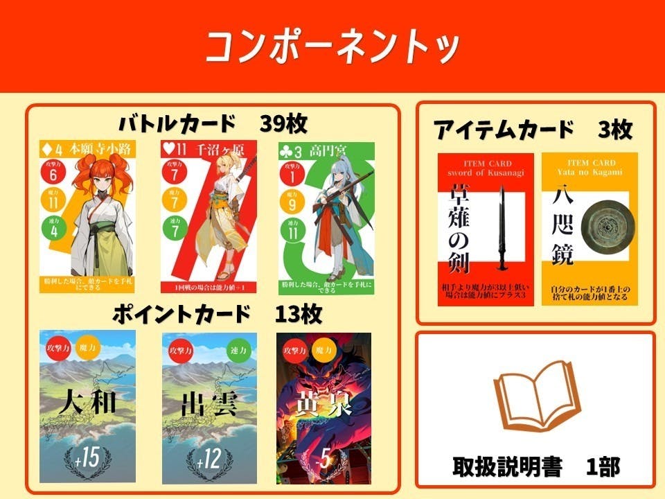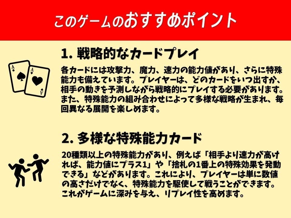 2~3名用の対戦型カードゲーム、戦略的なカードプレイや特殊能力カードを楽しむことができます。