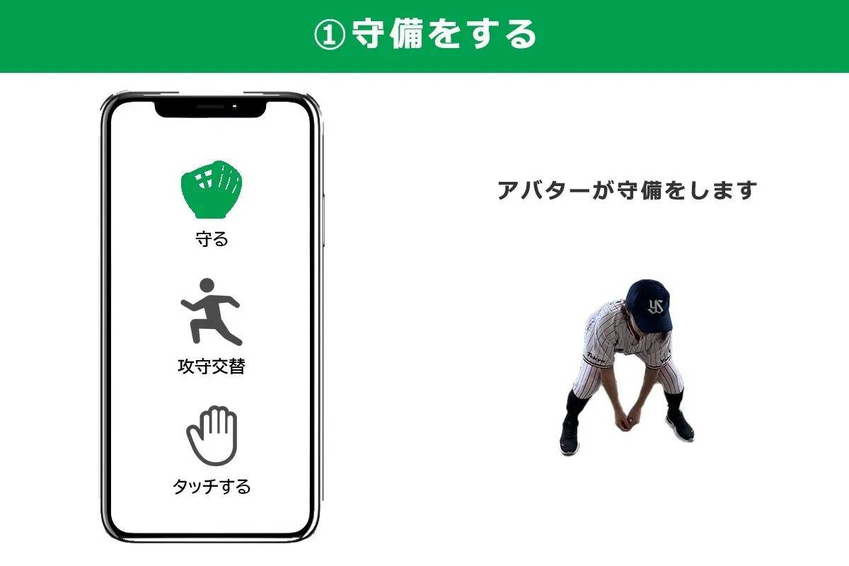 「守る」ボタンをタップすると、アバターがグラウンド上で守備をします。