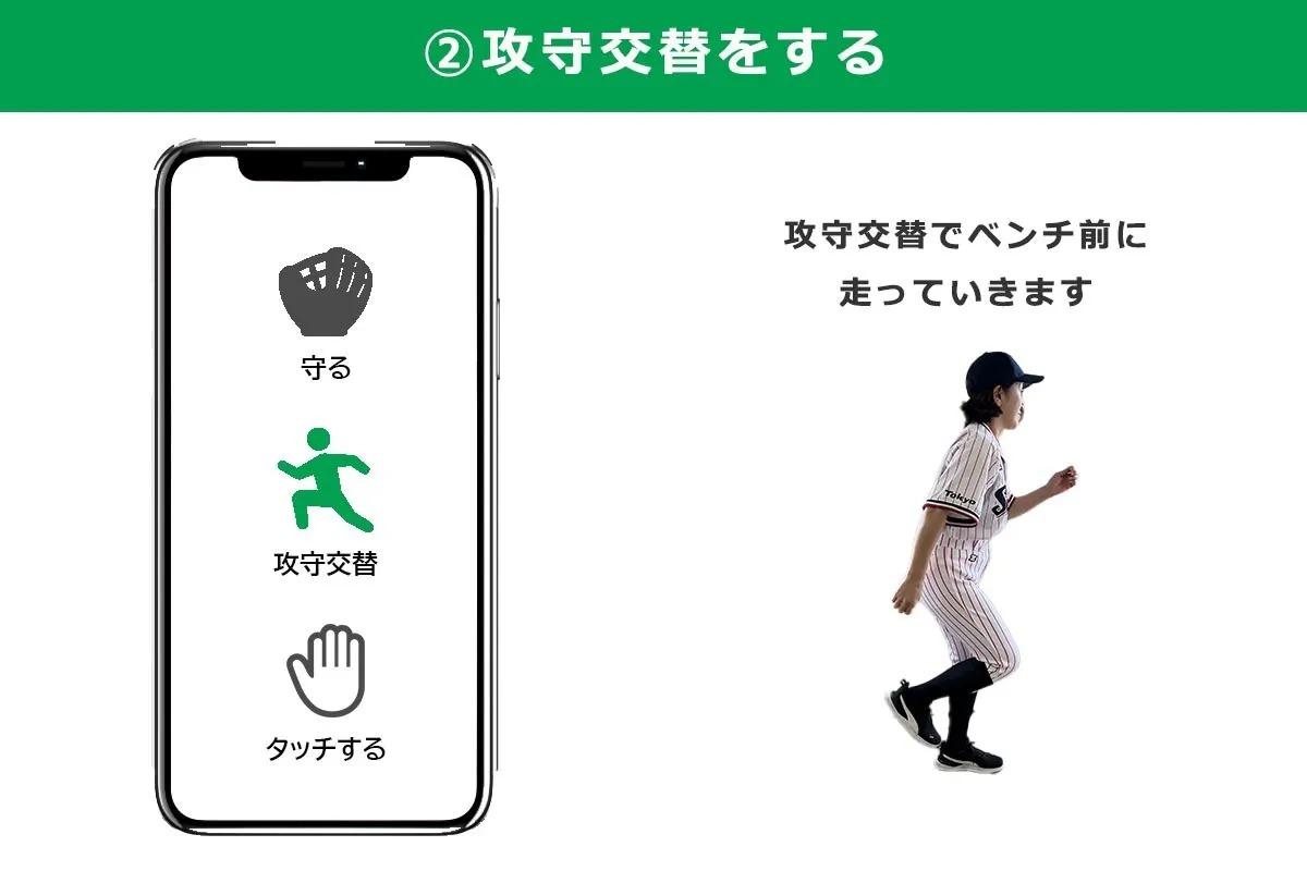 「攻守交替」ボタンをタップすると、アバターがベンチ前まで走っていきます。