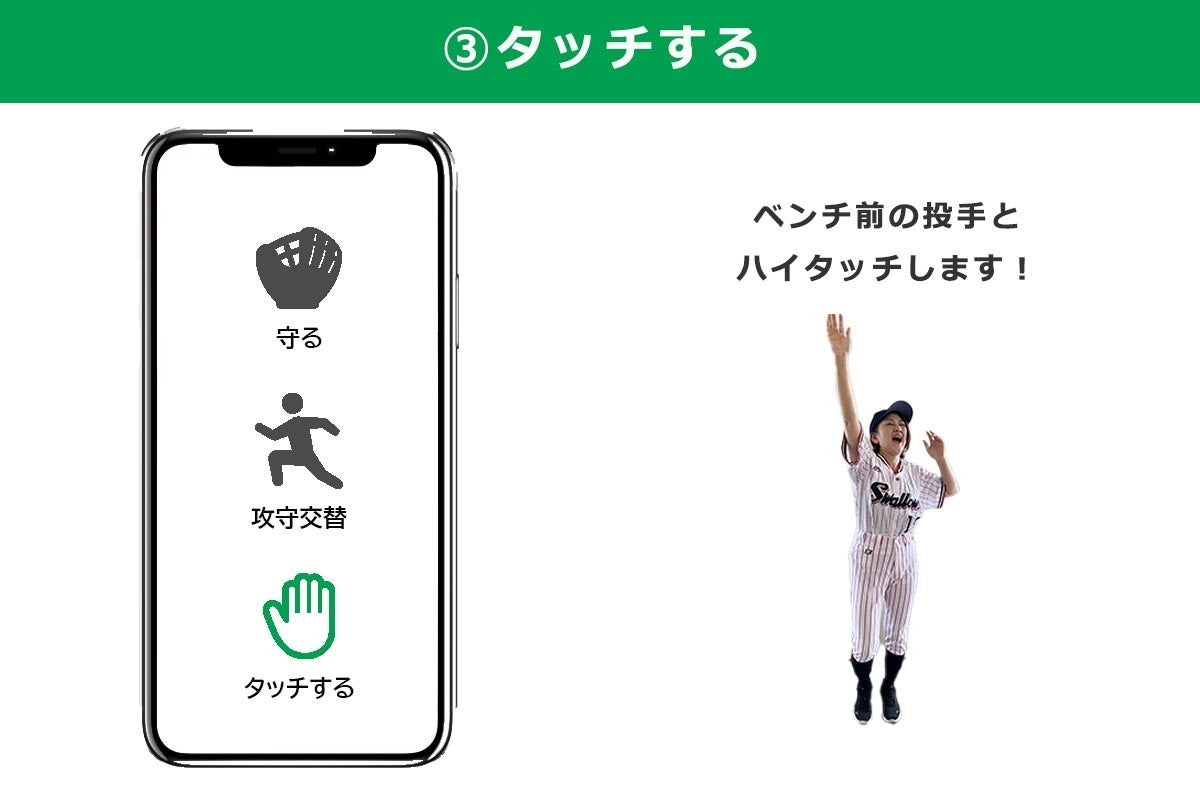 「タッチする」をタップすると、アバターがベンチ前にいる投手や野手とハイタッチやグラブタッチをします。