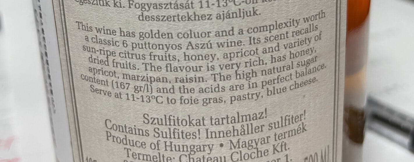 これは2012年ヴィンテージの金色の極甘口トカイワイン、Chateau Cloche Tokaji Aszu 6puttonyos 2012です。中ほどに167グラムの表記が見えます。