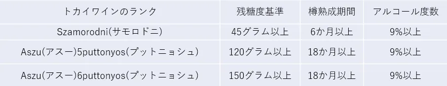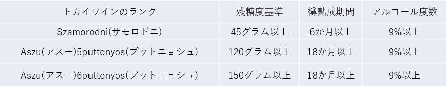 つまり、aszuを名乗っている以上、120グラム以上の残糖度が保証されるのです。しかも、aszuの中にも5puttonyosと6puttonyosという2つのランクがあり、6puttonyosは上記の表のように150グラム以上の残糖度がないと名乗れないのです。また、樽熟成期間や最低アルコール度数も決まっています。