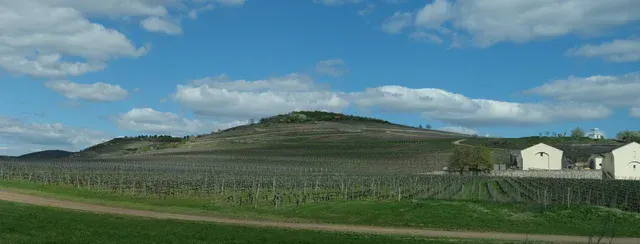 写真は一昨年4月にNAARを訪ねた際、車中から撮影したものです。トカイ地域には、多くの小高い丘があり、山肌や山裾にブドウ畑が広がっています。