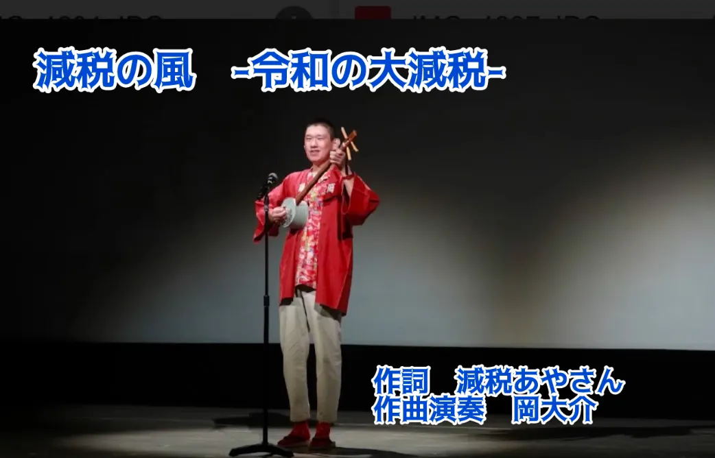 のステージで、令和の減税ムーブメントを”現代の自由民権運動”として、歌で発信できたら、と考えていたところ、ご縁をいただき、カンカラ三線演歌師の岡大介(おかたいすけ)さんに新曲の制作と演奏を依頼し、11月4日のイベントで発表されました!詞は減税あやさんが提供しました。今の政治の状況、減税の高まりを最大限歌に込めました。