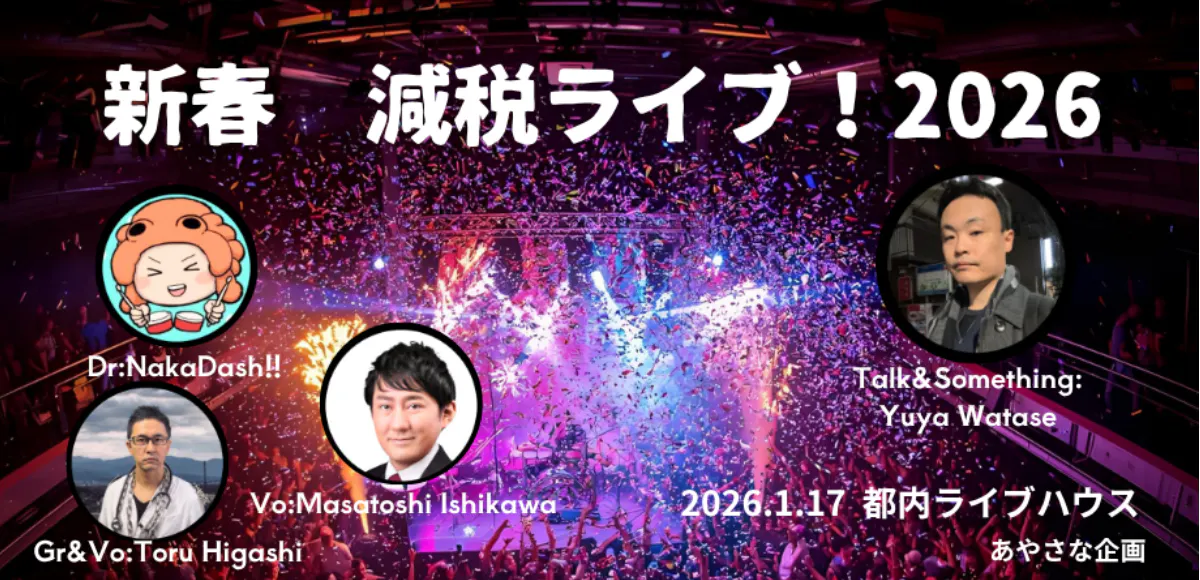 2025/12/25 15:53皆様、お元気ですか。年明け2026年1月17日土 15:00~ 新宿のライブハウスにて、減税ライブイベントを開催します!そこでなんと!Gr&Vo(ギターとボーカル)を務める東徹さん(精神科医)の歌と編曲でこの「減税の風」が生まれ変わります!!ロックな感じの中で、途中「仁徳天皇」のくだりではぐっと雰囲気が変わる感じに編曲してくださり、なるほどーと思いました!ぜひステージで、その興奮と感動を一緒に体験しませんか?新年の皮きりを、ぜひ楽しい減税イベントでスタート!!!みなさまのご参加をお待ちしています。お申し込みはPeatixから。https://genzei-live2026.peatix.com/減税あやさん もっと見る