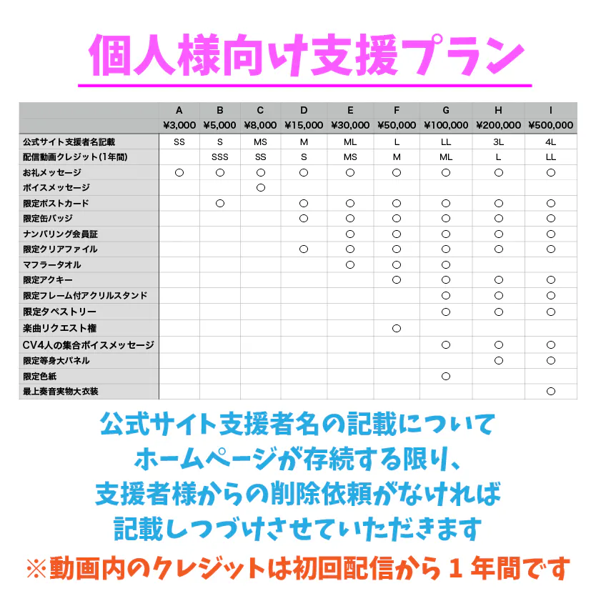 多くの方にご支援をいただけるように願いを込めて、様々なプランを用意しました。個人様プランでは、本プロジェクト限定のグッズの他にも、私が投稿動画で歌う曲の「リクエスト権」や、4人のクリエイターさんによるボイスメッセージなど、これからの私たちを象徴するリターンも考えました。