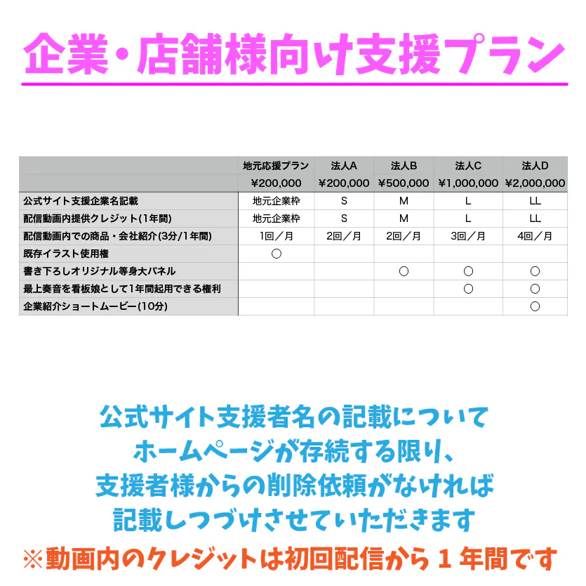 また、企業/店舗様向けのプランでは、これまでの活動から得た経験やノウハウからみなさまをお手伝いできるようなものをご用意させていただきました。ご支援いただいた企業/店舗様には今後開始する動画配信にてPRのお手伝いをさせていただいたり、私が看板娘として1年間活動させていただくといったプランもあります。