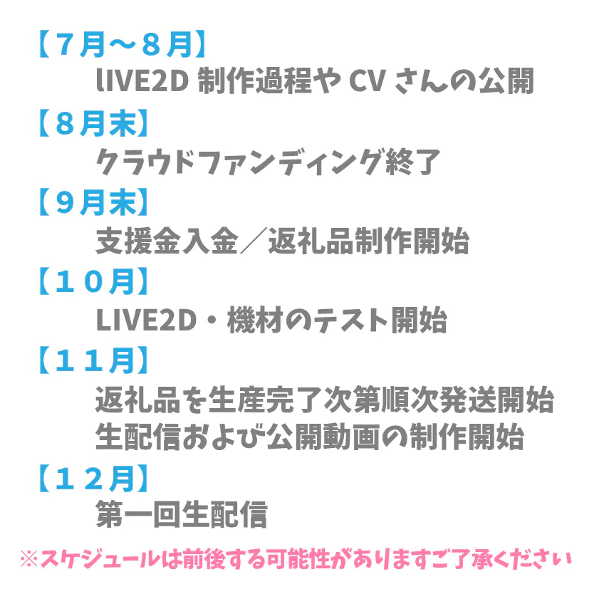 みなさまからのご支援をもとに、LIVE2Dモデルの制作をします。さらに私の声を担当してくださる声優の方々とともに活動する準備を進めていきます。年内には動画の配信活動をスタートさせ、近い将来には多言語化による海外への発信も計画しています!