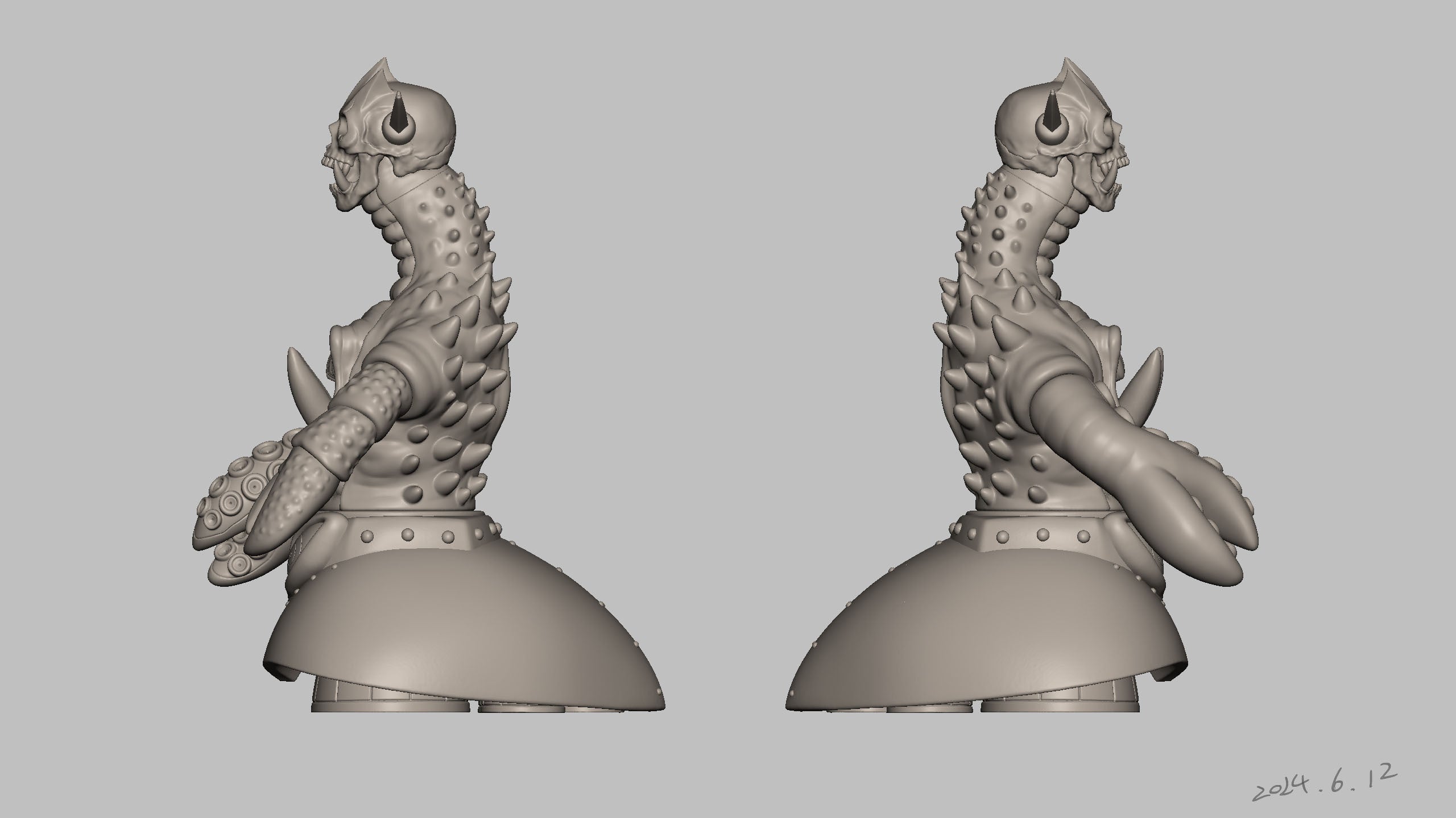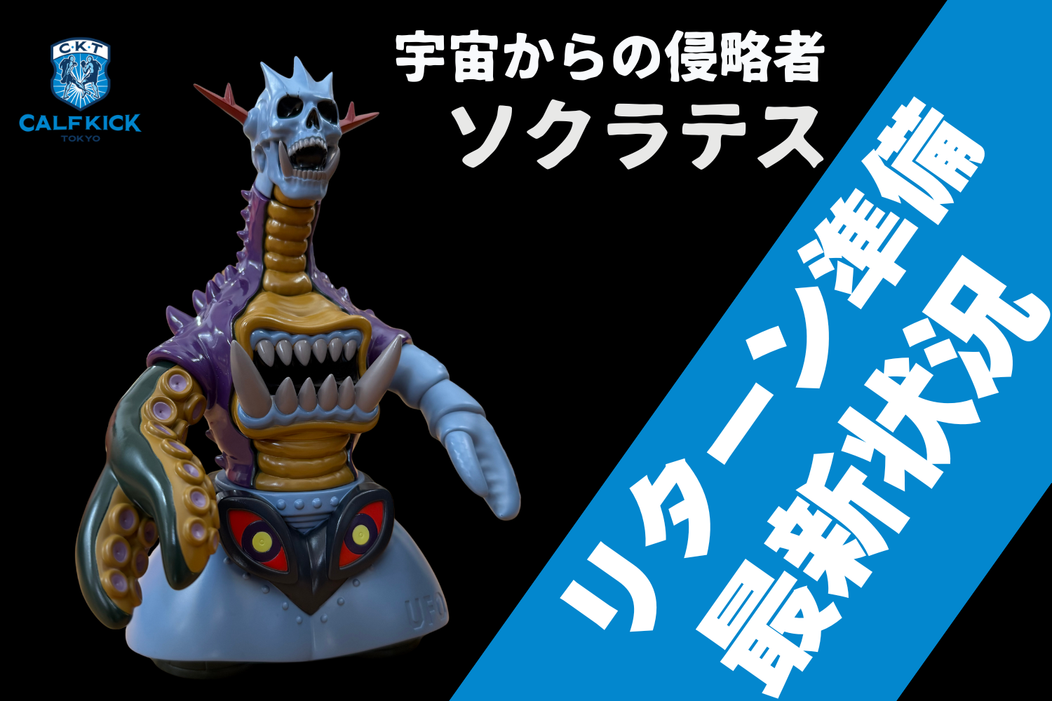 2025/12/30 16:412025年も残り僅か。年の瀬の大変お忙しい時期だと思いますが、ようやくこのご報告ができることを嬉しく思います。振り返ればこの進捗報告の投稿は8月以来の更新となります。なかなか私も進捗を把握できず、時間が空いてしまって申し訳ありません。ソクラテス1期カラーの納品開始大幅に遅れているソクラテス、パーフェクト・ソクラテスの彩色版ですが、本日ついにソクラテス1期カラーの納品が開始されました。「納品が開始された」というのは、つまり、本日私の手元に納品されたのは最初のロットということになります。手元に届いた「ほやほや」の状態ではありますが、何枚か写真を撮りましたので画像を共有させて頂きます。まずは斜め方向から胴を捻ってをこちらを向かせた感じ斜め上から撮影。背面はこんな感じになります。頭部の牙や口腔など彩色が難しいかなと思ったところはいくつかあったのですが、工場の方で丁寧に仕上げてくれました。彩色周りは今後発売する2期カラー以降の作品では少し工夫していきたいと思うところも何箇所かあるのですが、ひとまずお客様にお送りできる水準にはできたと考えています。今後の納品スケジュールは!?工場とのお約束では以下のスケジュールとなっています。◆12月30日納品(本日納品されたもの)・ソクラテス(1期):30体・ソクラテス(1期)拡張パーツ:全て◆1月10日納品・ソクラテス(1期):残り全て・ソクラテス(赫怒の侵略者):全て・パーフェクト・ソクラテス(1期):全て・パーフェクト・ソクラテス((赫怒の侵略者):全てこれらについては納品があり次第検収し、問題なければ順次発送を開始します。つまり、1月上旬から徐々に皆さんのお手元に届くことになります。一方、以下についてはまだ工場からサンプルも提示されておらず、もう少しお時間をいただくことになりそうです。申し訳ない。工場には急いでもらうように致します。・パーフェクト・ソクラテス(Mk1カラー)・パーフェクト・ソクラテス(Mk2カラー)遅延の原因は??ここまで遅延した原因はいくつかあります。【1】生産数まずは、何といっても数が多かった。。新規作品のため工場の方も手探りで塗っていく必要があるのですが、とにかく発注数が多いためまとまった時間を作って作業する必要があったのだと思います。工場は昨今のソフビブーム、作家の大量発生、ソフビイベントの急増により常に時間に追われている状況です。そのような中で新作でこれだけ個体数の多い生産はなかなか手をつけられなかったのではないかと想像します。これは工場を責めることはできません。限られたリソース、迫り来る納期の中でギリギリのスケジューリングをして各作家様の作品を生産しているためです。そもそもの私が皆さんに提示したスケジュールの見立てが甘かったと反省しています。【2】大量の彩色マスクによる生産工程の複雑さ彩色マスクが大量であったことも要因の一つです。別の進捗報告でも書きましたが、ソクラテス/パーフェクト・ソクラテスでは本当にエグい量の彩色マスクを使っています。これだけのマスクを使って生産する作品もあまりないのではないかと想像します。しかも、細かい部分もかなりあります。新作で勝手も分からない中でこれだけ細かい彩色をするのは手順書を作るだけでも大変だったと思います。いやホントに塗り分けをやりすぎましたね。。【3】想定外のトラブル彩色マスクの一部で「滲み」が出てしまうものがあるというトラブルも発生しました。これはカーフキック東京としては初めての経験でした。とはいえ、サンプルを確認した際に非常に軽微に感じられたため、正直「ソフビなんだからこのくらいであれば味があると言えるのではないか」と考えて許容したものもあったのですが、どうしても修正した方がいいというものもあり、作り直しの工程を踏みました。彩色マスクの委託先様も迅速に対応してくれたので委託先を責めるつもりもありません。そもそも工業製品というのはこういうものです。一定の割合でエラーが生じるのは仕方がない。一重に私のスケジュールの見立てが甘かったということに他なりません。今後の展望もうこれ以上軽々とスケジュールを記載してご支援者様をがっかりさせたくないのですが、パーフェクト・ソクラテス(Mk1カラー、Mk2カラー)については2月にはお届けできるようにしたいと心から思っています。工場の見通しが見えてきましたらまたこちらでご報告させて頂きますので、大変心苦しいですが、またしばらくお待ちください。最後に2025年も皆様にはカーフキック東京を盛り立てて頂き、大変ありがとうございました。本来であればたくさん苦情が来てもおかしくない状況だと思いますが、うちのお客様は皆さん本当に我慢強く待ってくださっています。だからこそ本当にスケジュールの見立ての誤りを不甲斐なく思います。この進捗報告ではお詫びしてばかりでしたが、新年が始まり次第できるだけ早くク