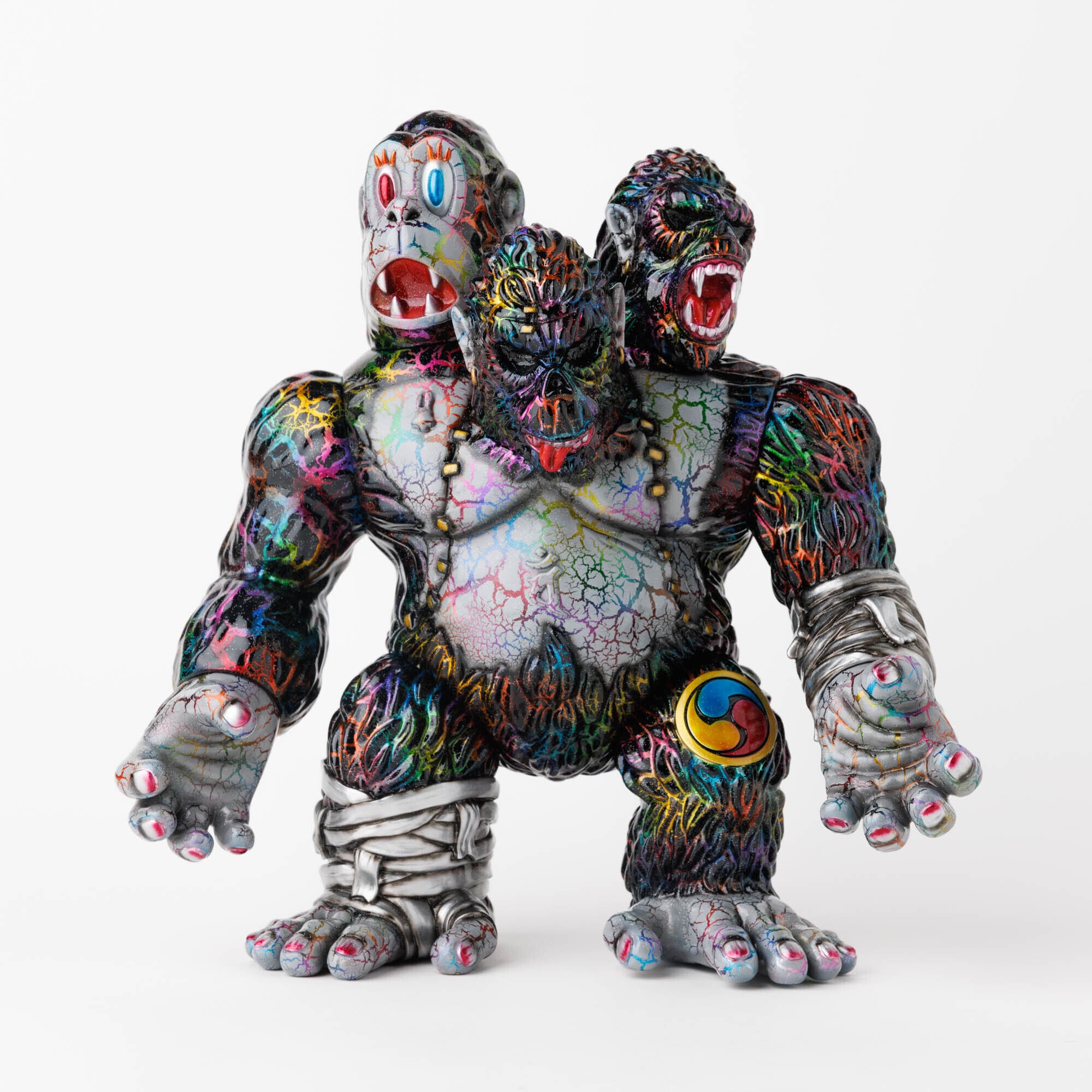 ●第2弾「タイド・キングス」。3つの頭を持つ大迫力なゴリラのソフビ。カーフキック東京のフラッグシップ作品。2期まで製作し全て完売済み。ナンバーシリーズ(1期、2期…)の他に、有名ペインターともコラボを多数実施。写真はペインター「PainterNet」様とコラボした最高のアートピースの1つ。