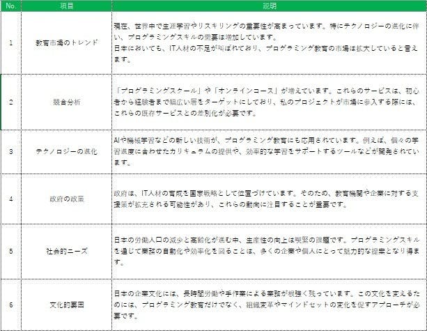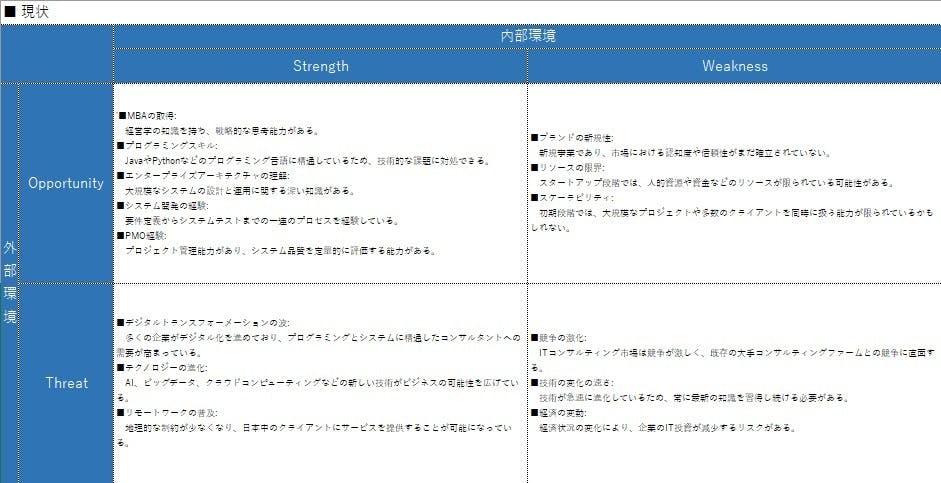 私がこのプロジェクトで実施しようとしている「ITコンサルタント(プログラミングができる)」ですが、素晴らしい方からのサポートを頂き、「市場分析」と「SWOT分析」を行いました。分析をして、今後市場的に発展があるのではないかという結論に至りました。