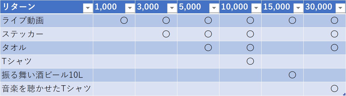 ご支援いただいた方全員に、お礼のメッセージと2日間のライブ動画(編集有り)をお送りいたします。また、支援額に応じてオリジナルグッズやその他特別なリターンもお送りいたします(詳細欄をご覧ください)。