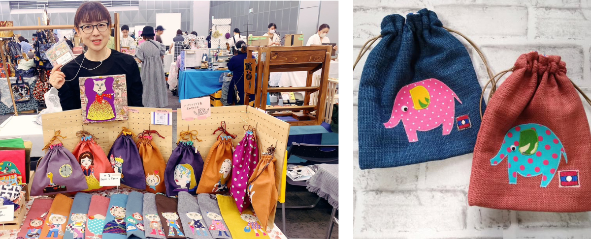 ラオスのイメージの「象」をアップリケし、STORYの皆さんからラオスの国旗のワンポイントとアイディアを頂きました。内布はラオスの国旗カラーの生地を使いました。