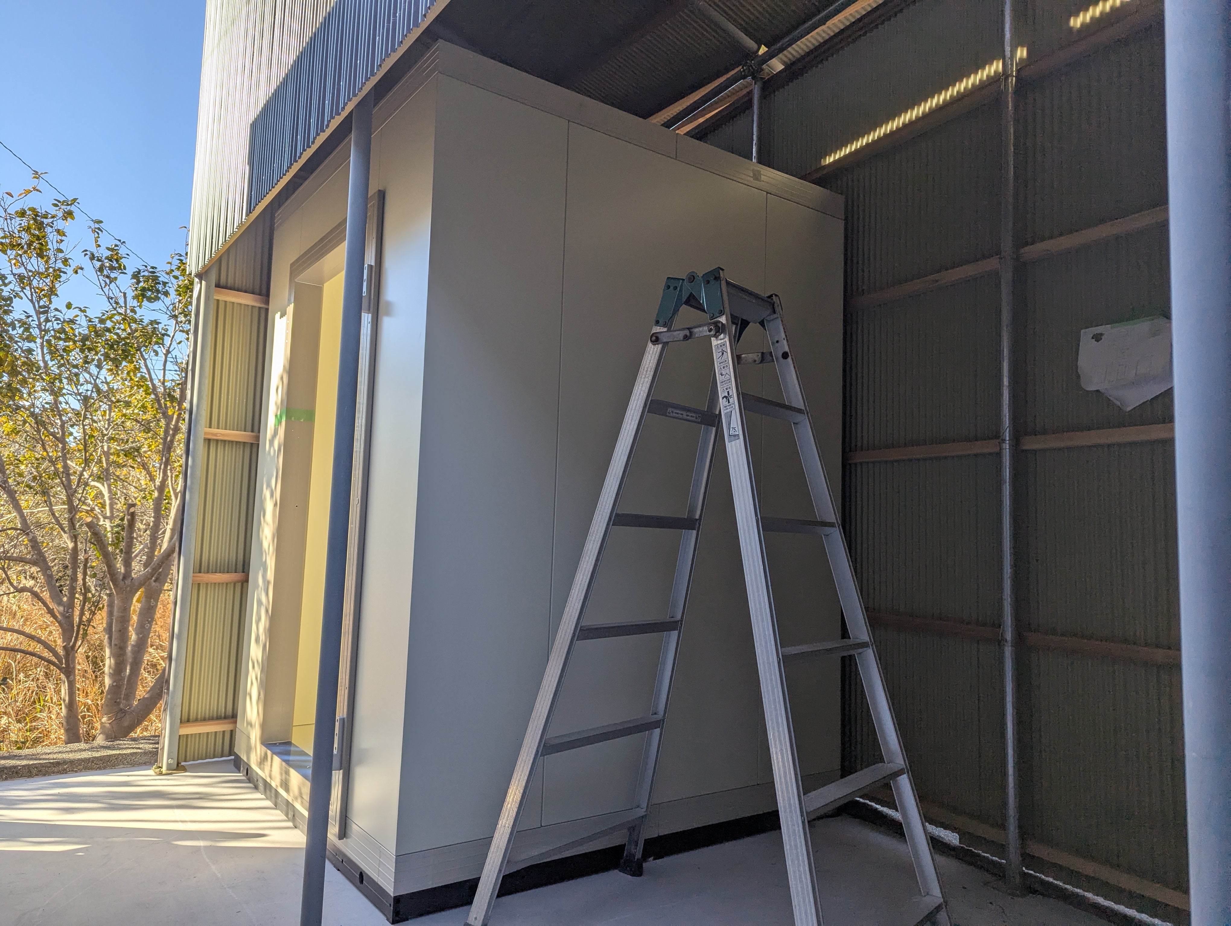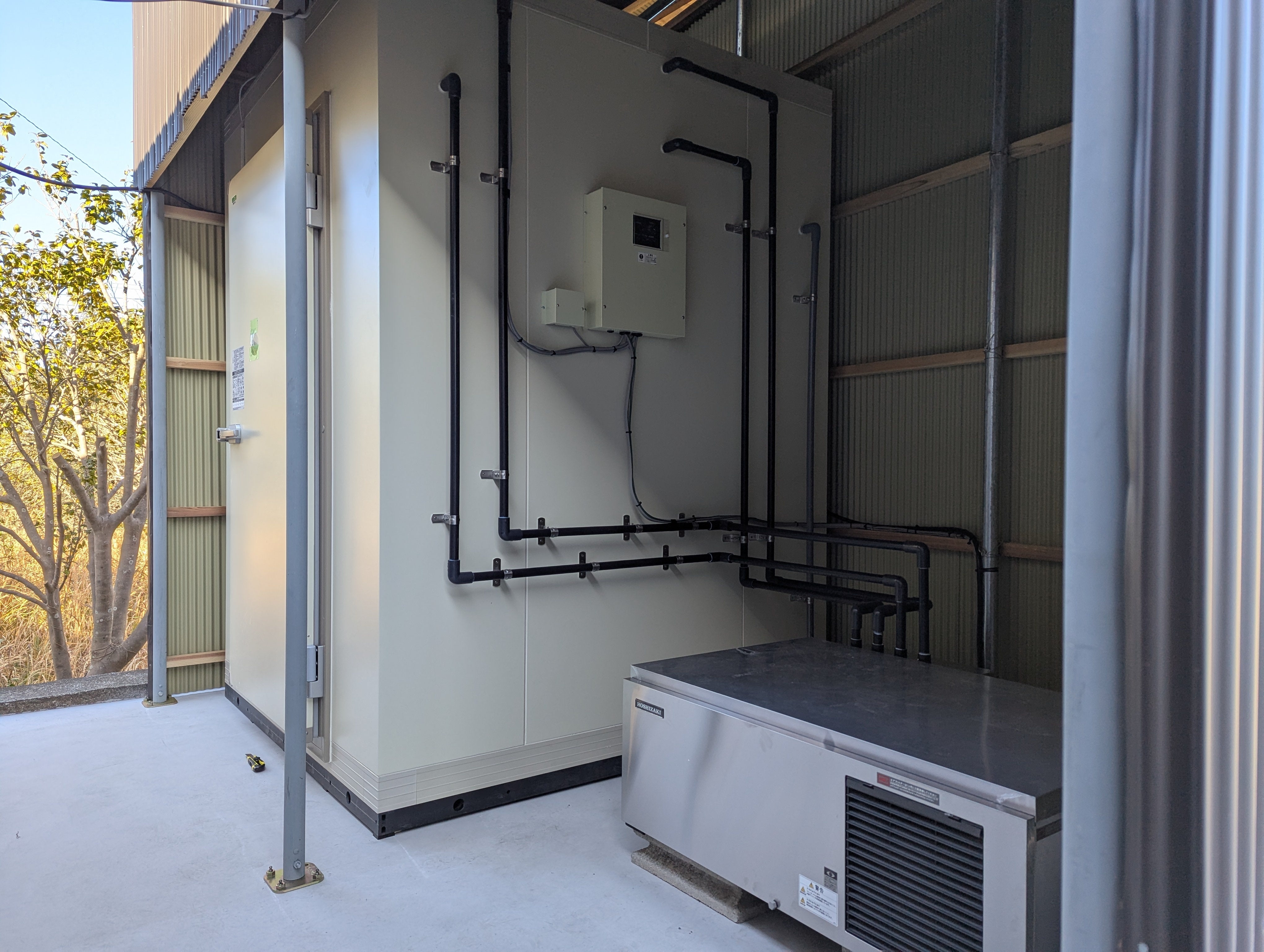 ※3枚目…プレハブ冷蔵室の配線、基盤が整ってきた様子