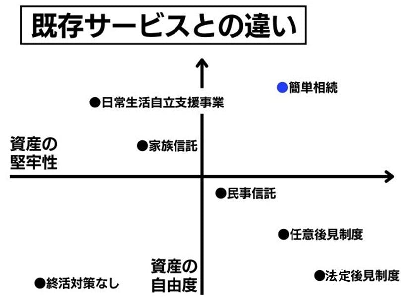 『簡単相続』では、この考えを更に進め、「任意後見制度+家族信託+公正証書遺言を組み合わせた新しいサービス」を提言しており、その資産管理を行うための仕組みを提供します。