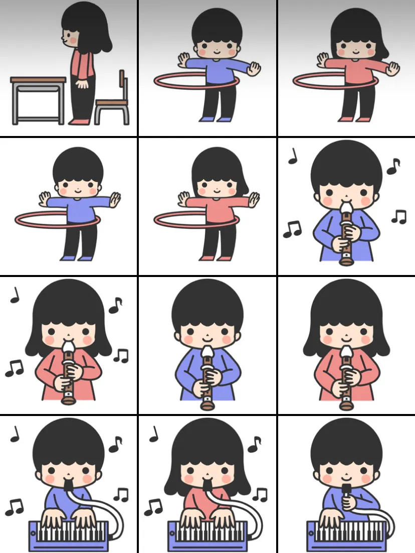 また、具体的に必要なイラストについて「リコーダーを吹いていないイラスト」「円の中に座るイラスト」「なわとびを持つだけのイラスト(振り回したり遊んだりをしていないイラスト)」など、フリー素材で探すのは難しいものもあると伺いました。