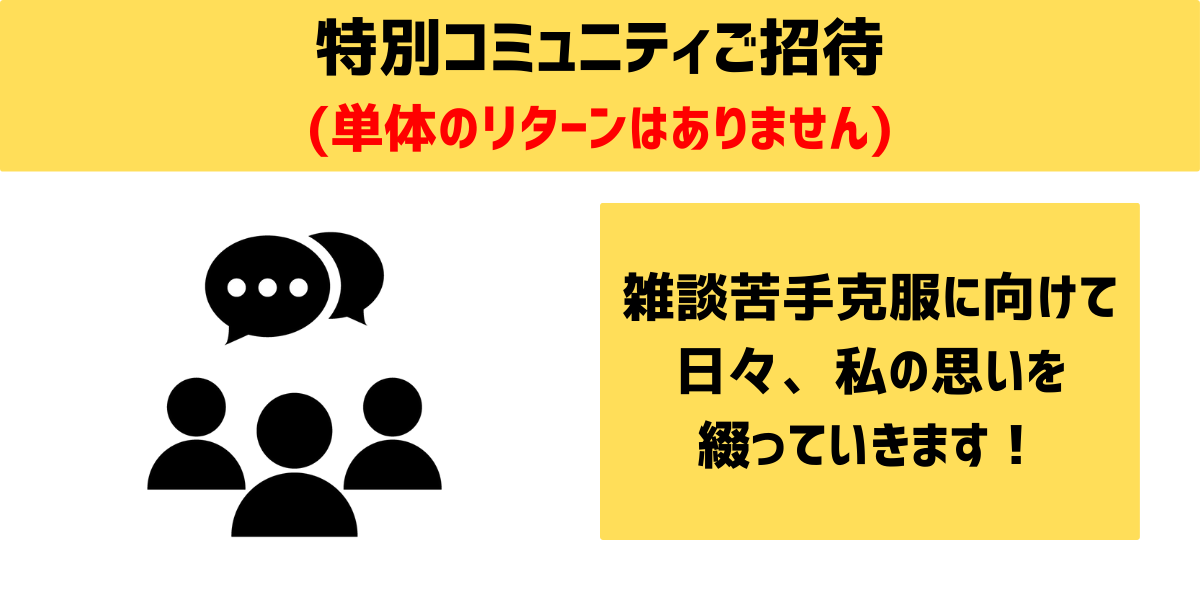 ※特別コミュニティとは…主に私と雑談アドバイスをしていただける方がコミュニケーションを取る場として考えています。私と同じ雑談苦手な方は無理に発言しなくてもOKです!もちろん匿名での参加もOKです!