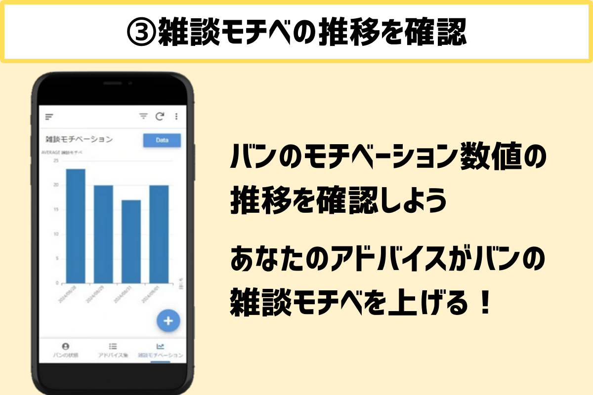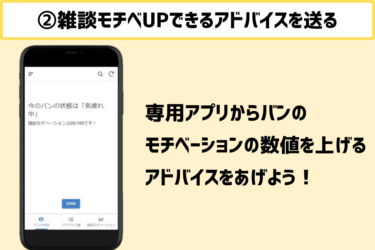 バンの状態をみて、バンのモチベーションの数値が上がるように、専用アプリから雑談アドバイスを送ります。