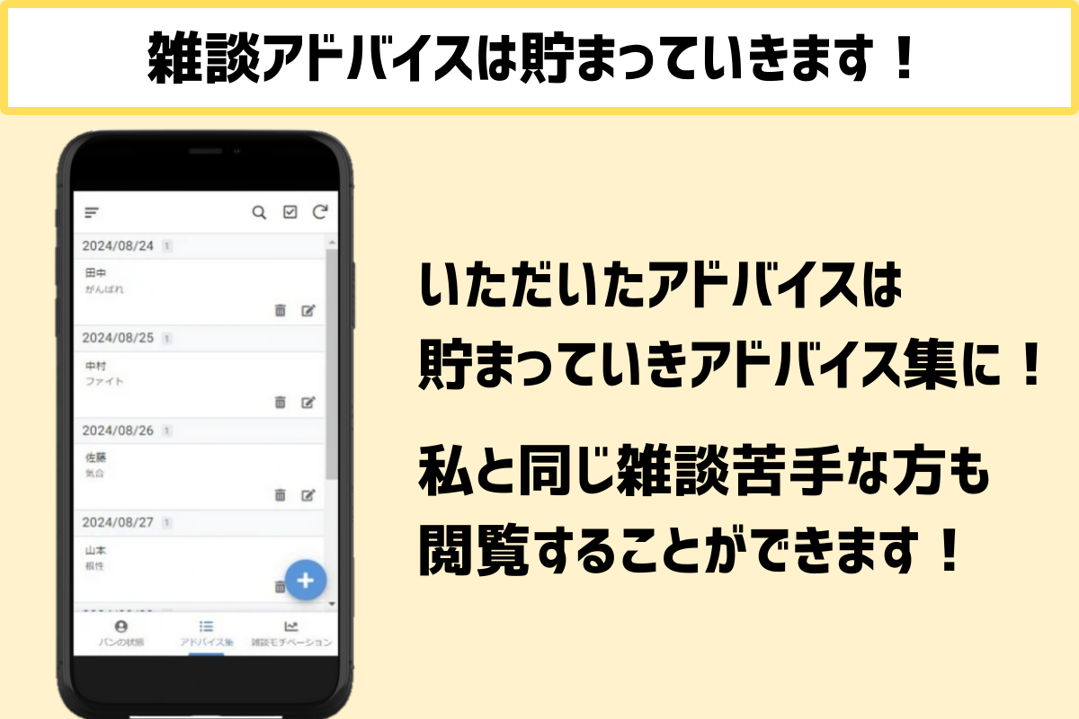 送っていただいたアドバイスは蓄積されていきアドバイス集となっていきます。いつでも誰でも閲覧可能なので私と同じ雑談に苦手意識を持つ方も参考にすることができます。