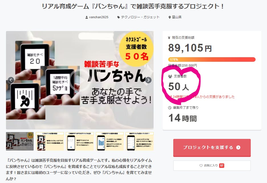 2024/09/26 10:21こんにちはVanです!この度は私のプロジェクトにお気に入り、ご支援いただきありがとうございます。クラウドファンディングが本日最終日となりました。500円から支援可能ですので、支援忘れがないよう最後の一押しをよろしくお願いします!本日は、2つNEWSをお届けします!【NEWS①:ネクストゴール支援者数50名達成!】皆さまのご支援のおかげで、ネクストゴールに設定した支援者数50名を達成することができました!!ほんっとうにありがとうございますm(__)m最後のゴール設定としてサードゴールを設定します。サードゴールは、支援者数60名です!これが最後の目標設定となります!残り10時間余りですが、最後まで熱量もって活動を続けて参ります!『バンちゃん』完全版は残り2名、簡易版は残り9名までの限定リターンです。量産販売は考えていないので、この機にぜひ手に入れて私を応援してくださいm(__)m【NEWS②:DEMODAY登壇!】プロトアウトスタジオ主催のプロトアウト DEMO DAY vol10 -「作ってみた」のその先を共有するイベントに登壇しました!こちらから(5分弱)視聴可能なので、ぜひ僕の熱いを聴いていただけると嬉しいです!今までで1番いい発表ができたと思います!正直できることなら悩みを打ち明けることなく、雑談苦手を克服したいと思っていました。しかし、勇気を出して人に頼るプロジェクトに切り替えたからからこそ、雑談苦手をオープンにしてたくさんご支援、応援の声をいただけたとおもっております。動画をご覧いただいて、私の思いに共感応援いただける方はぜひ、最後のご支援をよろしくお願いいたします。プロジェクトオーナー Van もっと見る