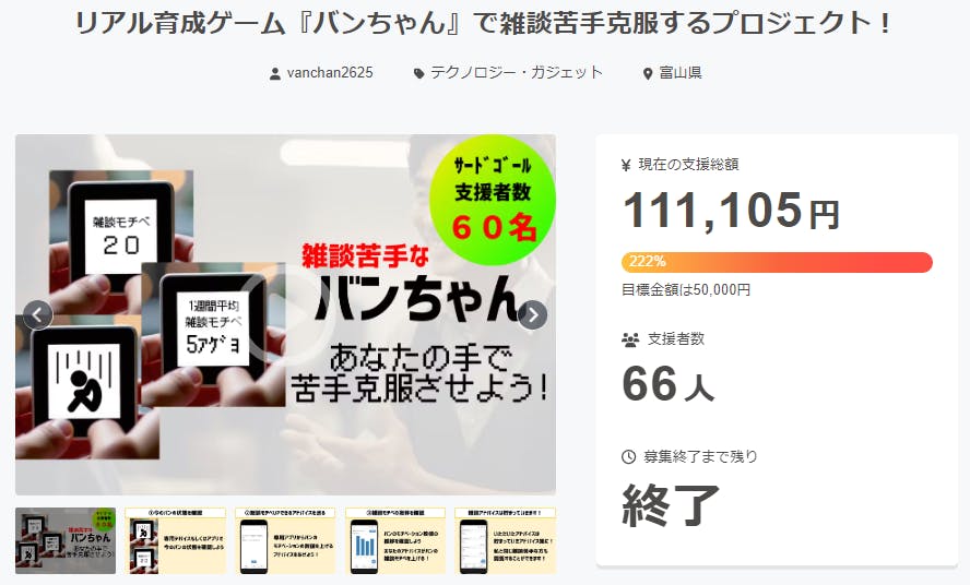 2024/09/27 08:24Vanです!!ついに2週間のクラウドファンディングが終了しました。。。結果は、目標金額50,000円に対して、111,105円、目標支援者数60名に対して、66名でサクセスを迎えることができました!!ご支援、SNSで拡散など応援いただいた皆さまありがとうございましたm(__)mリターンに関して、10月より順次ご連絡させていただきます。私自身『バンちゃん』の開発も始まるのでワクワクしています!!ただ、、、結果として大成功に終わりましたが、実は決して順風満帆ではなかったんですよね。そんな裏側のアナザーストーリーを5分間の音声メモに残したので聴いてみてください。(画像をタップもしくはクリックすると聴けます)最後になりますが、この2週間は一生分の感謝をしたような気持ちです。このたびは本当にありがとうございました!!これからもSNSで発信を続けていくので、また皆さんと交流できることを楽しみにしております^^プロジェクトオーナー Van もっと見る