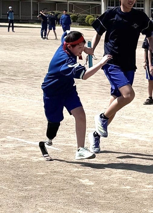 まだまだ競技用義足に不慣れな謙信君でしたが、安全な直線およそ20mをクラスの一員としてバトンを繋ぎました。