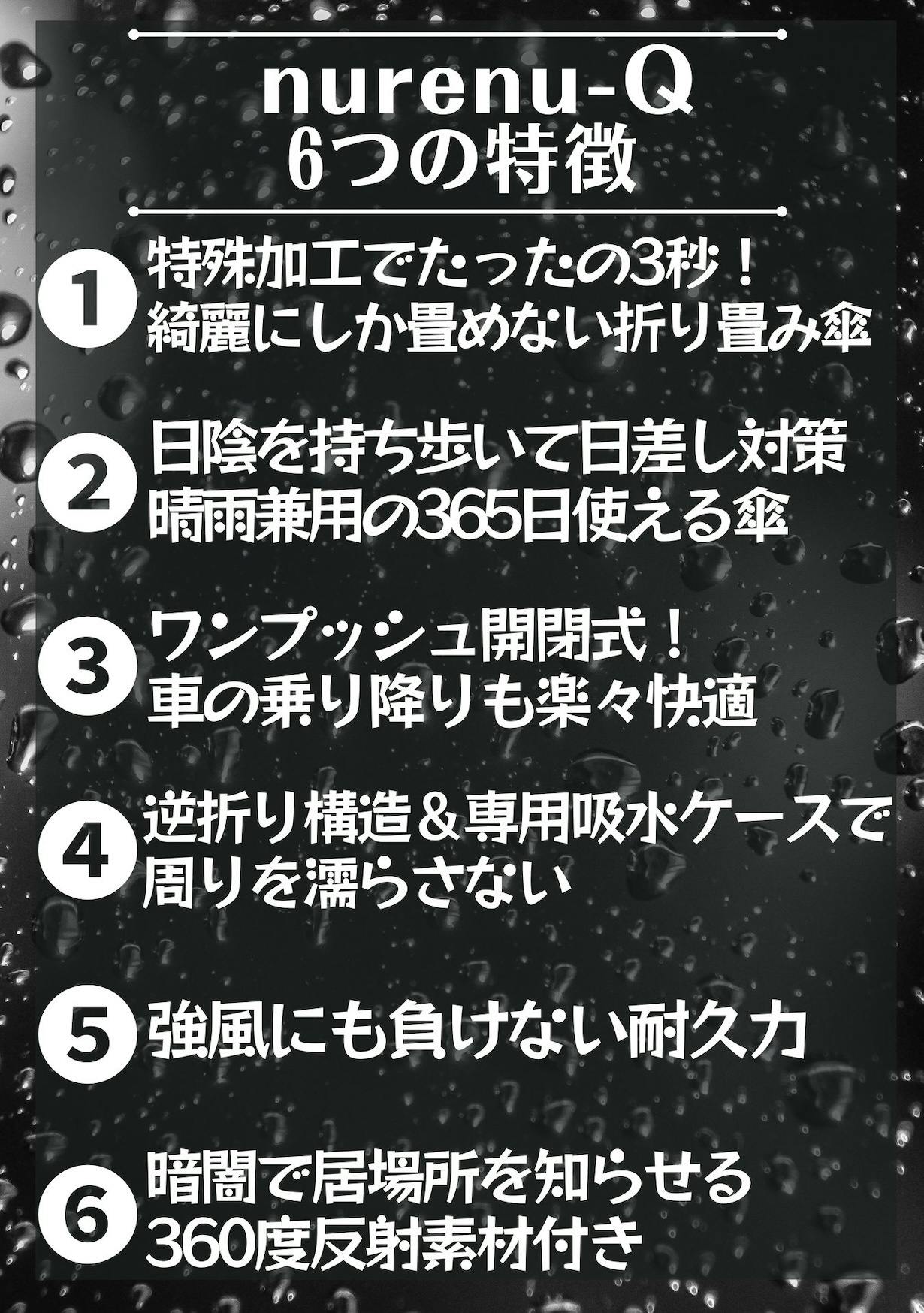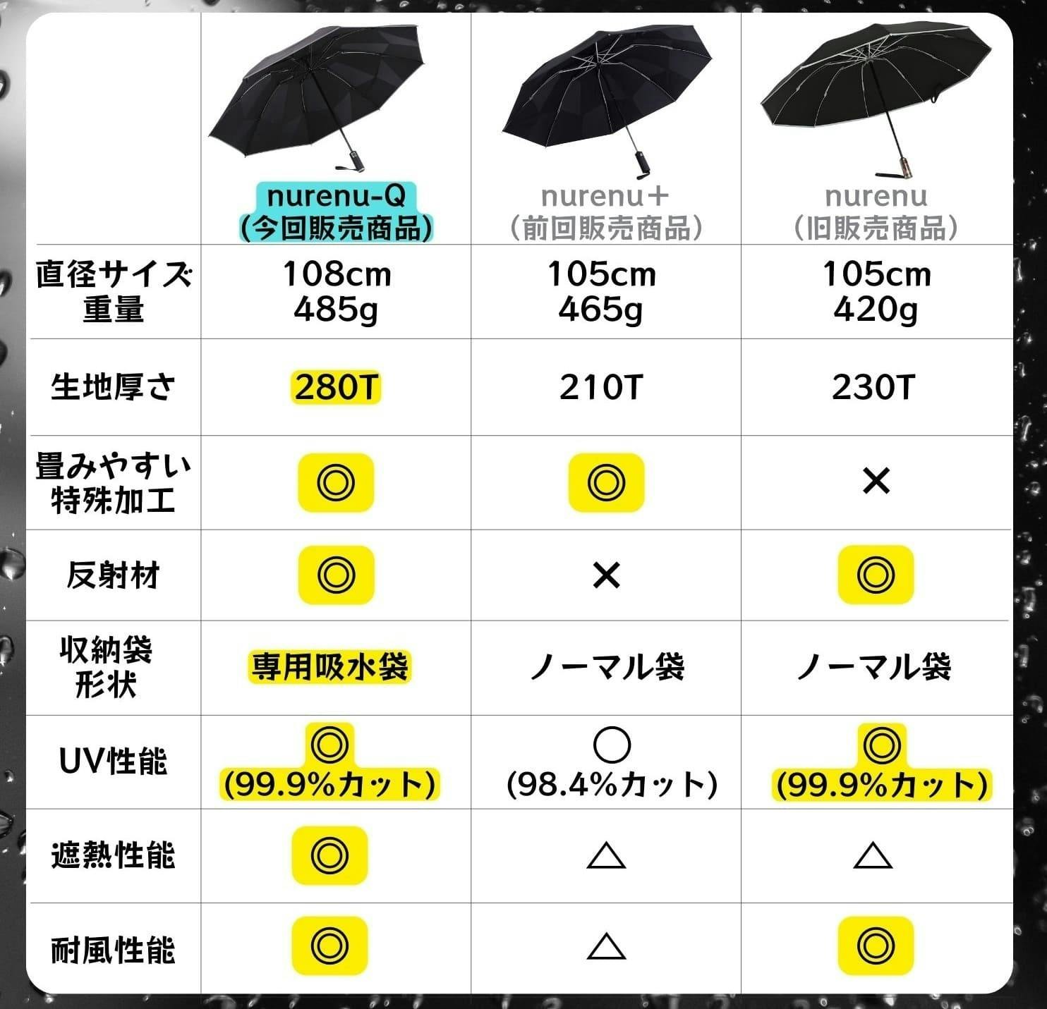 またnurenu-Qは生地も厚く遮熱力も過去に販売してきたnurenuシリーズの中では最も高く、日傘としてもより活躍してくれる晴雨兼用傘です!ぜひ皆様にこの快適な折り畳み傘をご使用いただき、憂鬱な雨も楽しくお過ごしいただければ幸いです。スタッフ一同、最後まで精一杯対応させていただきますので、何卒宜しくお願い致します。
