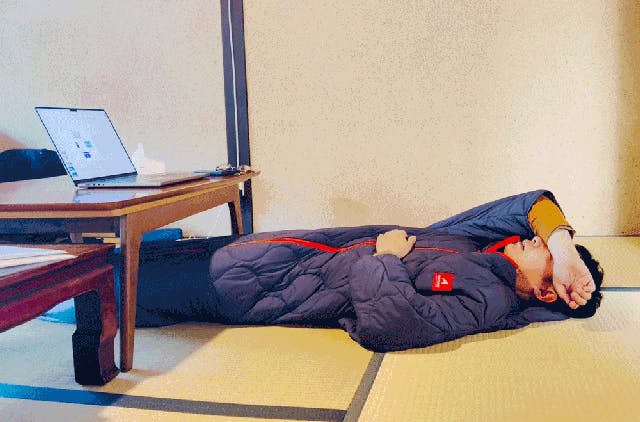 リモートワークのお昼休み。少しの仮眠にわざわざお布団へいかなくても、防寒に着ていたZUBORA BENCH COAT SCHLAFを着たままごろりと休憩もできちゃいます!