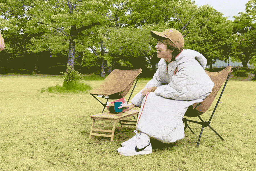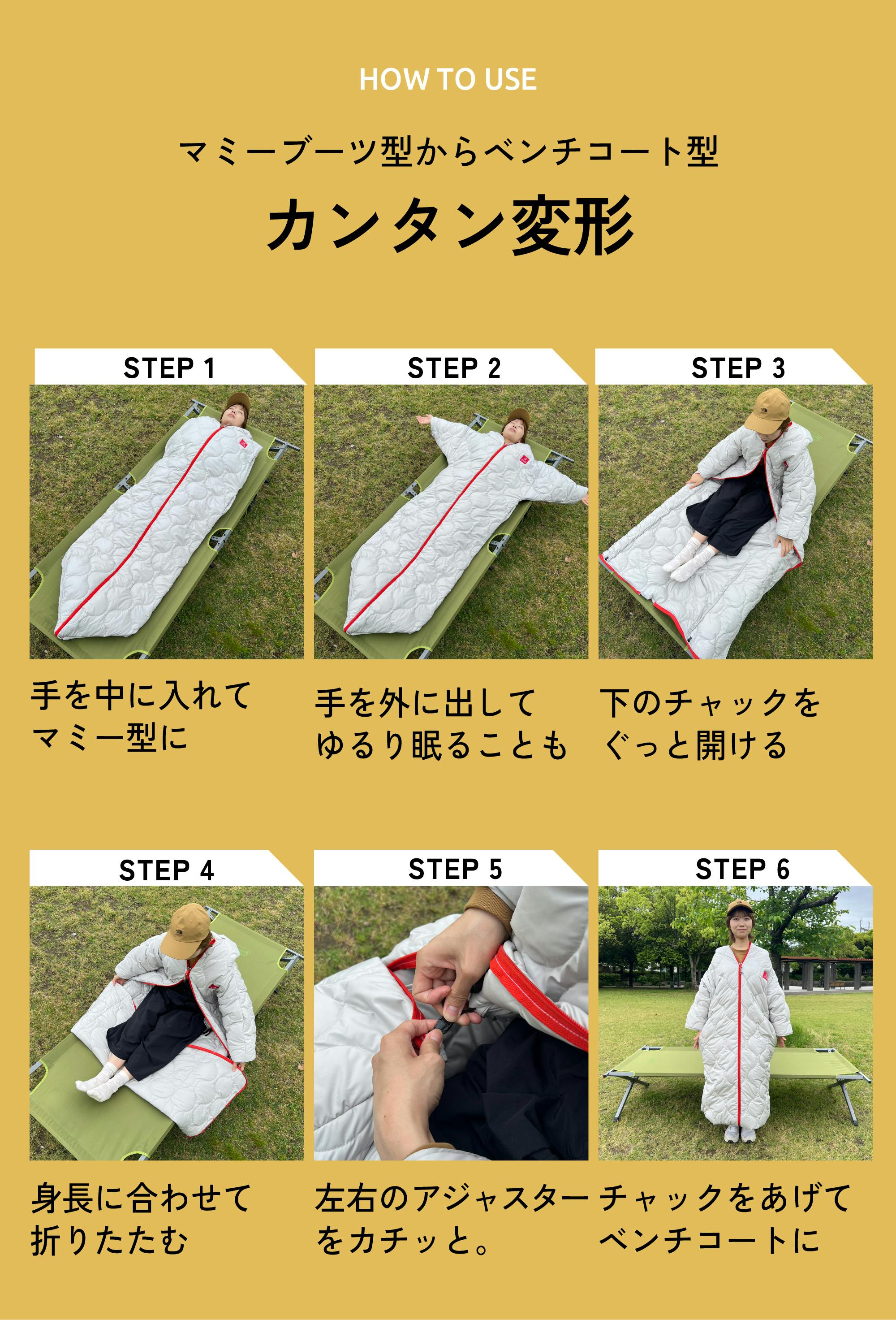 腕を中に入れてマミーブーツ型の暖かなシュラフとして、裾を折り返してベンチコートタイプとして。春・夏・秋・冬の4シーズン、どんなシーンでもお使いいただけます。