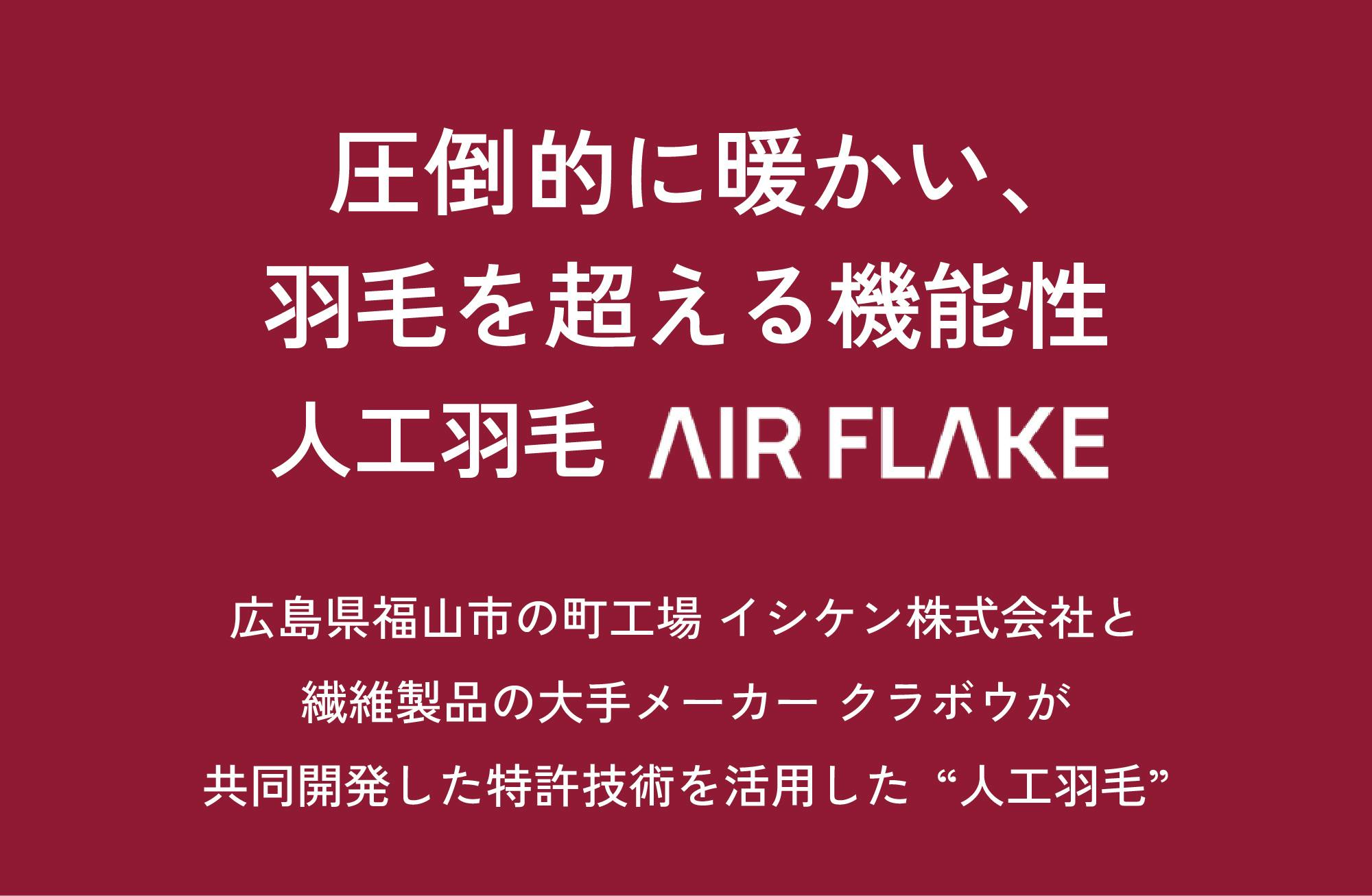 AIR FLAKE®︎は、「羽毛に学び、羽毛を超える」をコンセプトに、プロジェクト実行者であるイシケン株式会社とクラボウが共同開発した次世代の人工羽毛。