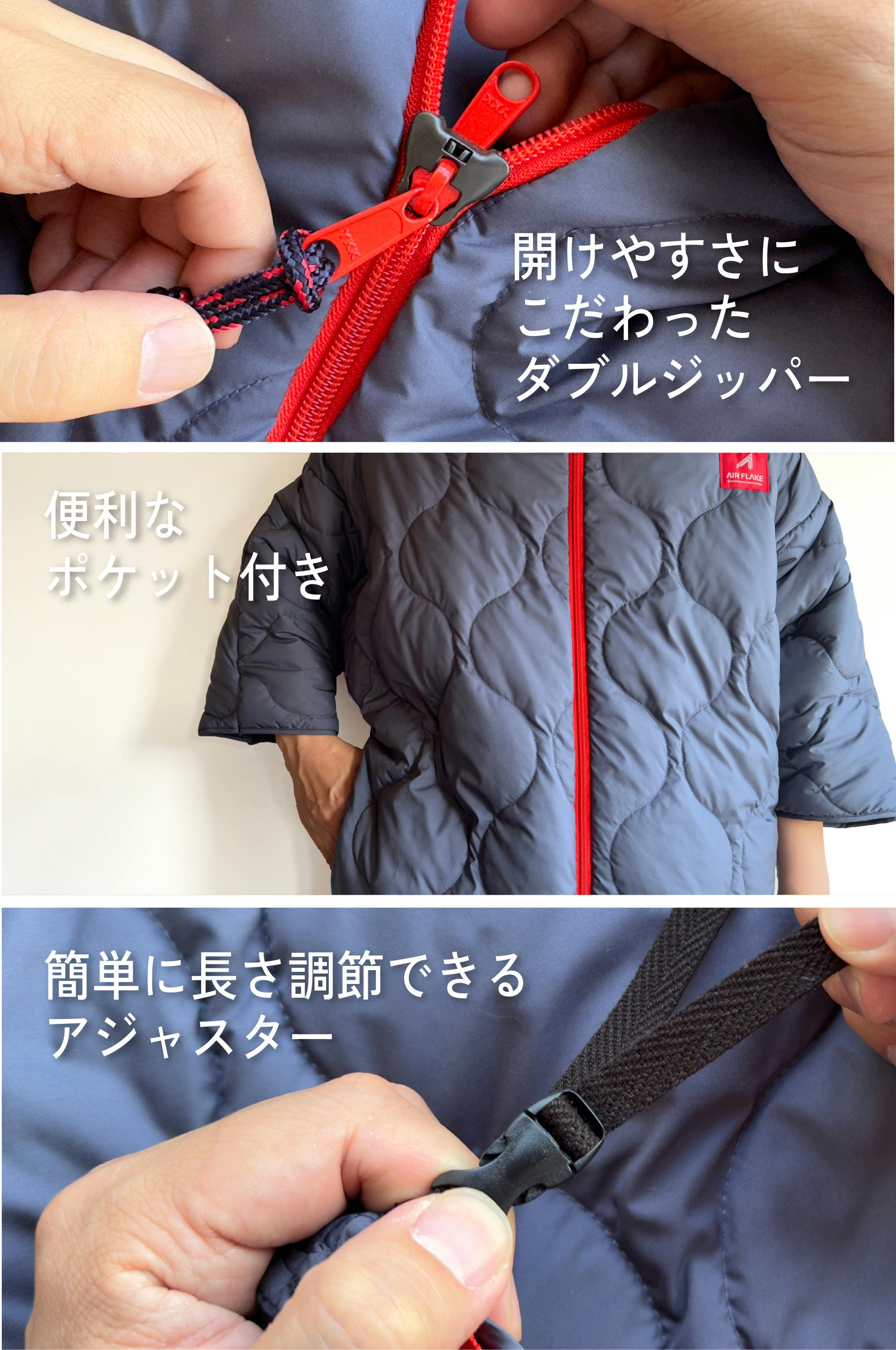 ご家族みんなで着ることができる、ジュニアサイズとレギュラーサイズの2サイズ。出先の急な寒さにも、車にひとつ置いておけば安心。さっと羽織ることができます。