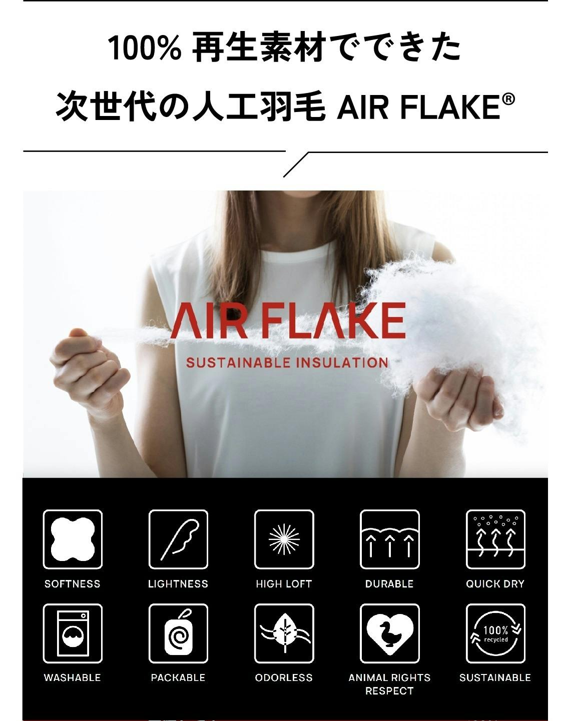 ZUBORA BENCH COAT SCHLAFの包み込むような暖かな寝心地は、人工羽毛「AIR FLAKE®︎」によって生み出されます。