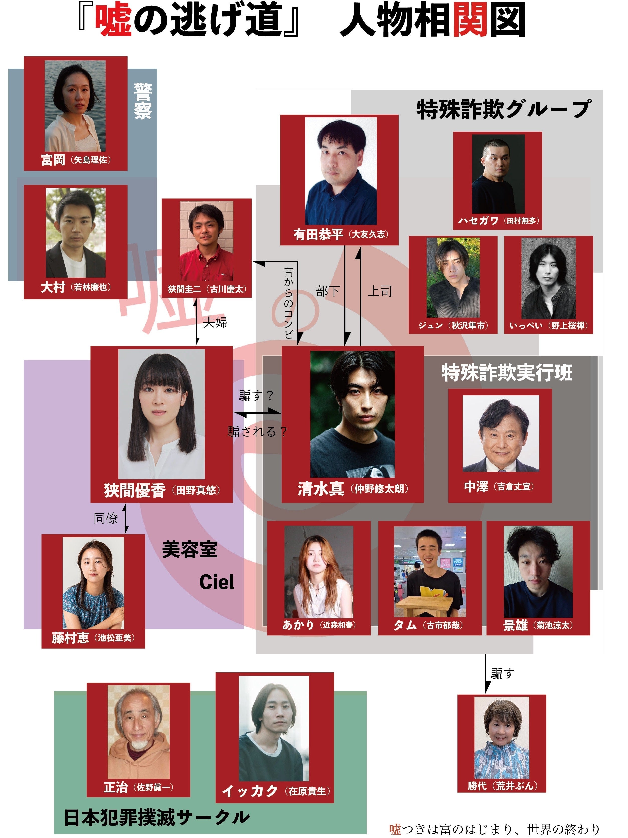 「みなさん初めまして。狭間圭二役の古川慶太です。オーディションの際に脚本を読んでみて、役柄としてもとても面白いと感じていたので、今回狭間圭二役として寺岡組の一員になれたこと、嬉しく思います。改めまして、詐欺師だけどケイジです。僕はこれから寺岡組の活動に参加していくわけですが、作品を多くの方々に届けられるよう、また皆さんの熱意に負けないよう全力を尽くす所存です。今後もSNSで諸々投稿されていくと思いますので、皆さん温かい応援宜しくお願いします!」古川慶太