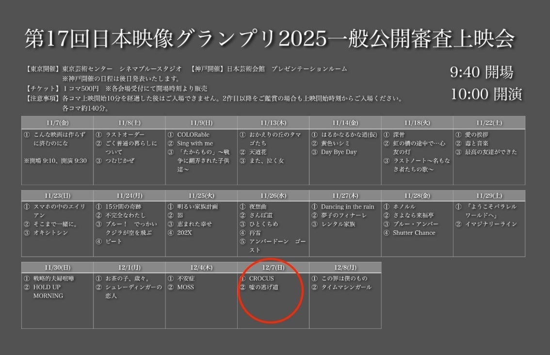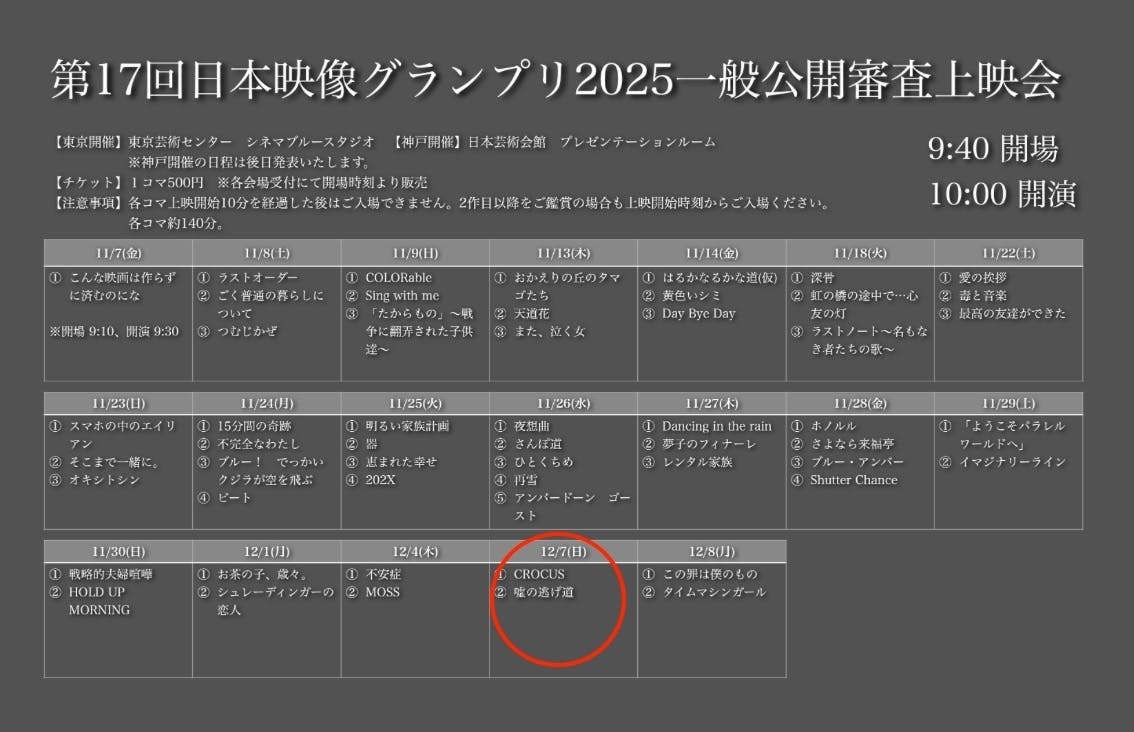 2025/11/30 18:35お久しぶりです!『嘘の逃げ道』スタッフです☺︎この度、『嘘の逃げ道』が日本映像グランプリ2025の一次選考を通過し、一般審査会に進むことになりました!一般審査会では、観客の皆様も投票して審査にご参加いただけます!東京と神戸で上映がありますので、お近くの方はぜひ観ていただき、本作を応援していただけますと嬉しいです。上映会詳細▽◯東京会場日時:2025年12月7日(日) 10:00開演(9:40開場)場所:東京芸術センター シネマブルースタジオチケット:1コマ500円(当日会場にて開場時刻より販売開始)注意事項:開演10分後以降は入場できません。別のエントリー作品1本と合わせての上映となりますが、2作目(『嘘の逃げ道』)のみを観たい方も開演時刻から入場する必要があります。合わせて約140分の予定です。詳細はこちら◯神戸会場日時:2025年12月7日(日) 19:00開演(18:50開場)場所:日本芸術会館 プレゼンテーションルームチケット:1コマ500円(当日会場にて開場時刻より販売開始)注意事項:開演10分後以降は入場できません。別のエントリー作品1本と合わせての上映となりますが、2作目(『嘘の逃げ道』)のみを観たい方も開演時刻から入場する必要があります。合わせて約140分の予定です。詳細はこちら今後もSNSなどでも情報発信していきますので、よろしくお願いいたします! もっと見る
