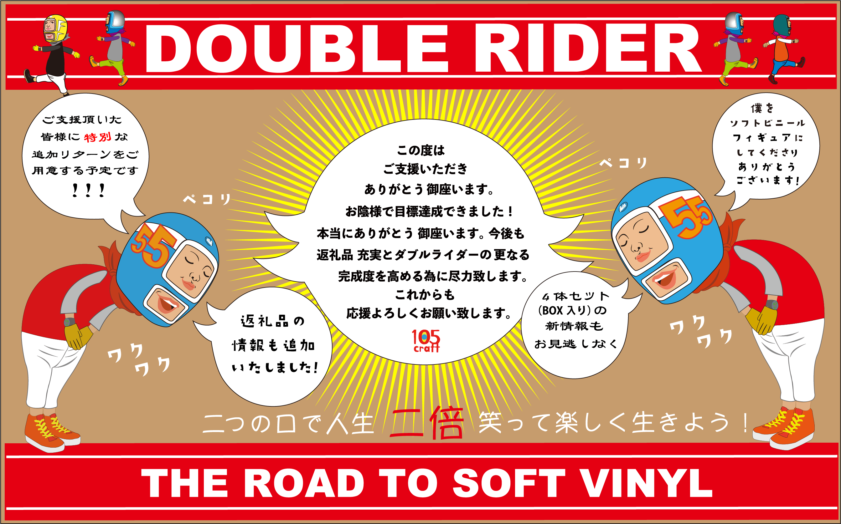 引き続き、皆様の温かいご支援をお待ちしております。ダブルライダーソフビ化プロジェクトをどうぞよろしくお願いいたします!
